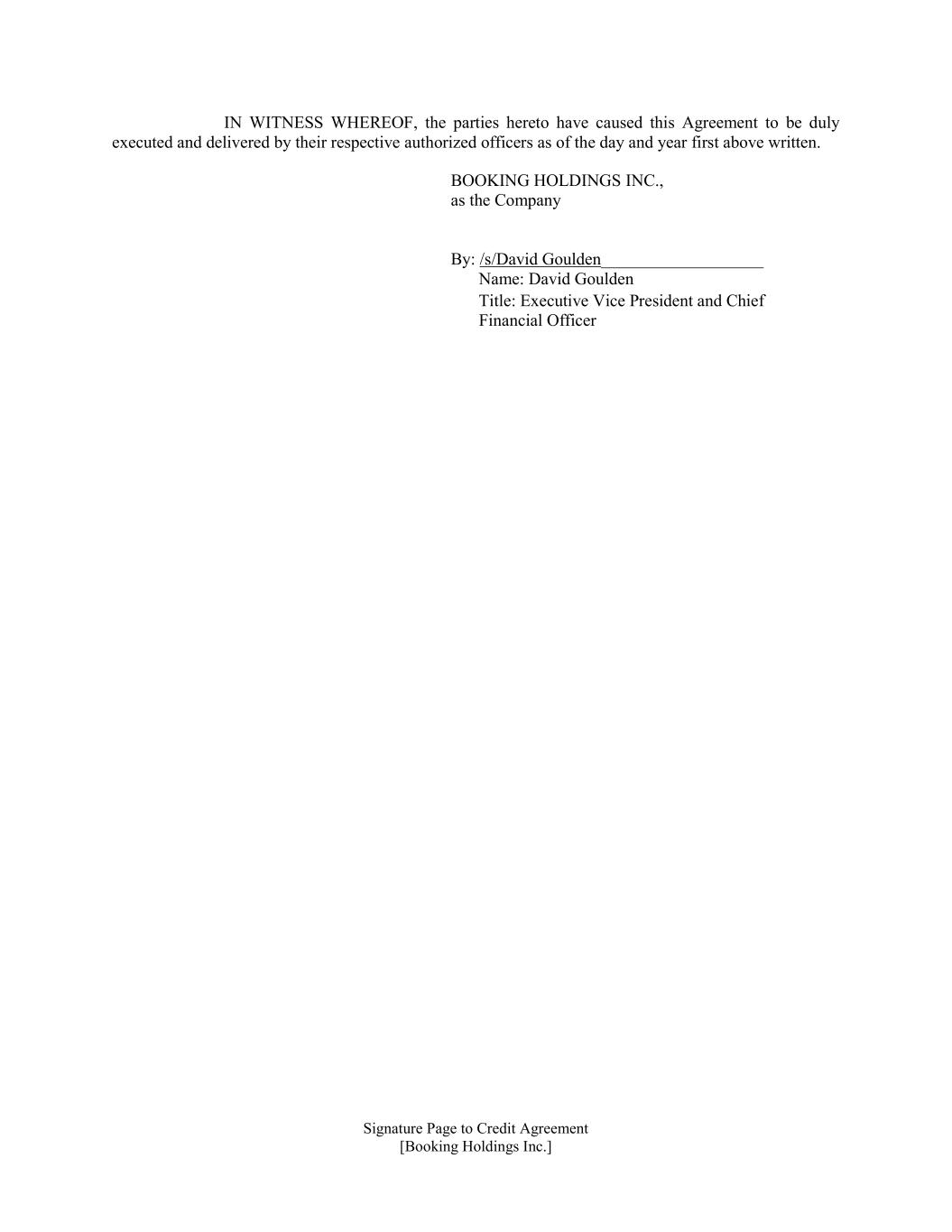 Signature Page to Credit Agreement [Booking Holdings Inc.] IN WITNESS WHEREOF, the parties hereto have caused this Agreement to be duly executed and delivered by their respective authorized officers as of the day and year first above written. BOOKING HOLDINGS INC., as the Company By: /s/David Goulden___________________ Name: David Goulden Title: Executive Vice President and Chief Financial Officer