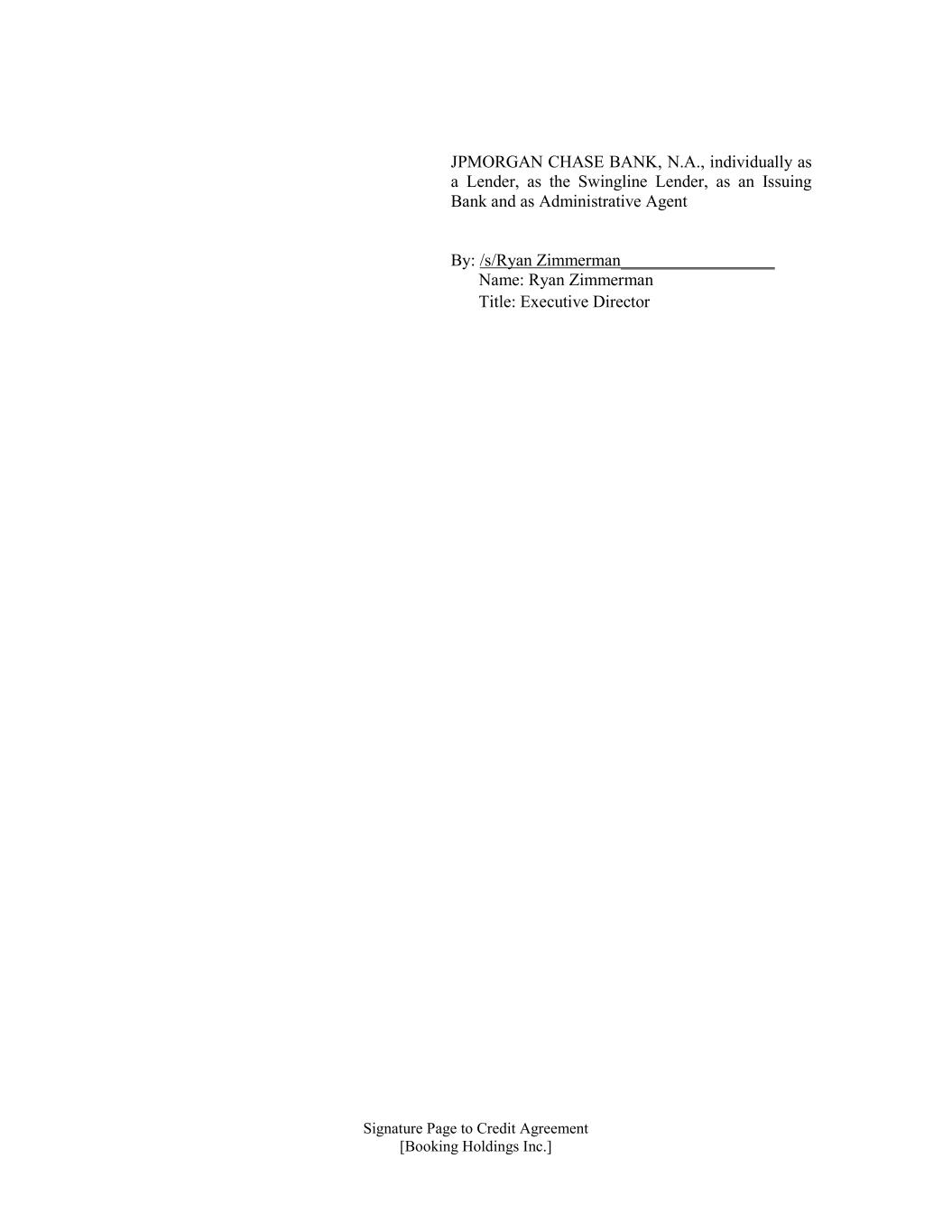 Signature Page to Credit Agreement [Booking Holdings Inc.] JPMORGAN CHASE BANK, N.A., individually as a Lender, as the Swingline Lender, as an Issuing Bank and as Administrative Agent By: /s/Ryan Zimmerman__________________ Name: Ryan Zimmerman Title: Executive Director