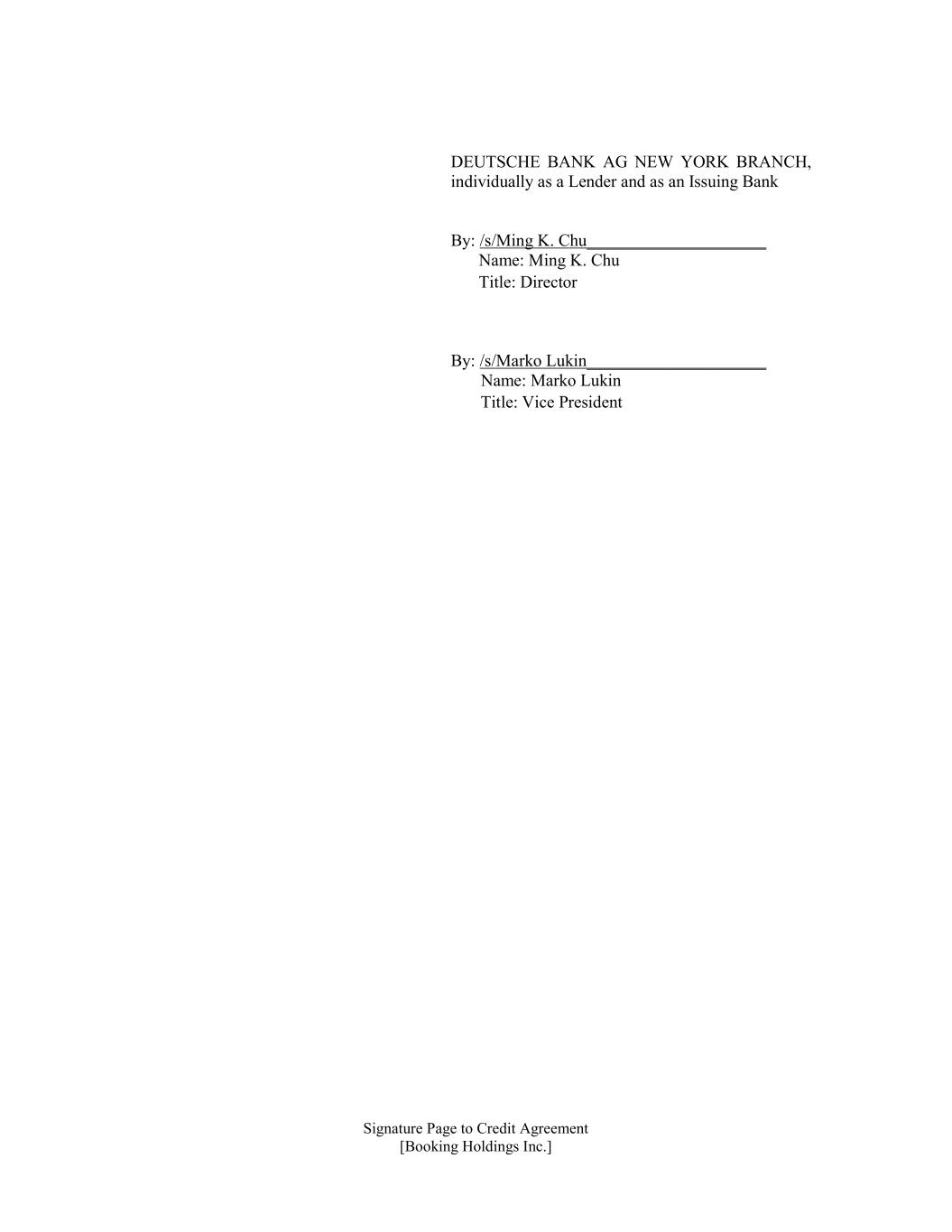 Signature Page to Credit Agreement [Booking Holdings Inc.] DEUTSCHE BANK AG NEW YORK BRANCH, individually as a Lender and as an Issuing Bank By: /s/Ming K. Chu_____________________ Name: Ming K. Chu Title: Director By: /s/Marko Lukin_____________________ Name: Marko Lukin Title: Vice President