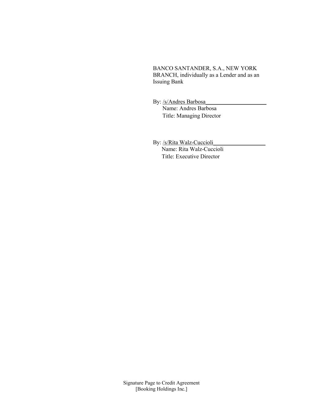 Signature Page to Credit Agreement [Booking Holdings Inc.] BANCO SANTANDER, S.A., NEW YORK BRANCH, individually as a Lender and as an Issuing Bank By: /s/Andres Barbosa_____________________ Name: Andres Barbosa Title: Managing Director By: /s/Rita Walz-Cuccioli__________________ Name: Rita Walz-Cuccioli Title: Executive Director