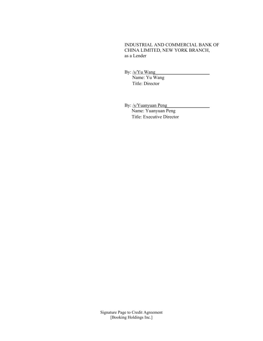 Signature Page to Credit Agreement [Booking Holdings Inc.] INDUSTRIAL AND COMMERCIAL BANK OF CHINA LIMITED, NEW YORK BRANCH, as a Lender By: /s/Yu Wang_______________________ Name: Yu Wang Title: Director By: /s/Yuanyuan Peng__________________ Name: Yuanyuan Peng Title: Executive Director