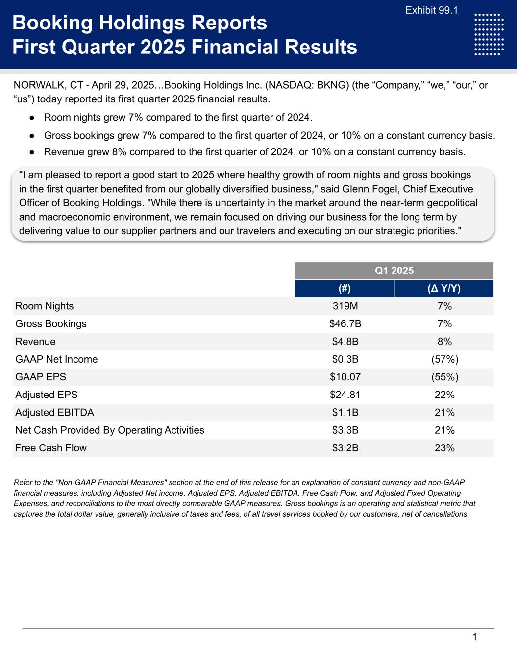Booking Holdings Reports First Quarter 2025 Financial Results NORWALK, CT - April 29, 2025…Booking Holdings Inc. (NASDAQ: BKNG) (the “Company,” “we,” “our,” or “us”) today reported its first quarter 2025 financial results. ● Room nights grew 7% compared to the first quarter of 2024. ● Gross bookings grew 7% compared to the first quarter of 2024, or 10% on a constant currency basis. ● Revenue grew 8% compared to the first quarter of 2024, or 10% on a constant currency basis. Q1 2025 (#) (Δ Y/Y) Room Nights 319M 7% Gross Bookings $46.7B 7% Revenue $4.8B 8% GAAP Net Income $0.3B (57%) GAAP EPS $10.07 (55%) Adjusted EPS $24.81 22% Adjusted EBITDA $1.1B 21% Net Cash Provided By Operating Activities $3.3B 21% Free Cash Flow $3.2B 23% 1 "I am pleased to report a good start to 2025 where healthy growth of room nights and gross bookings in the first quarter benefited from our globally diversified business," said Glenn Fogel, Chief Executive Officer of Booking Holdings. "While there is uncertainty in the market around the near-term geopolitical and macroeconomic environment, we remain focused on driving our business for the long term by delivering value to our supplier partners and our travelers and executing on our strategic priorities." Refer to the "Non-GAAP Financial Measures" section at the end of this release for an explanation of constant currency and non-GAAP financial measures, including Adjusted Net income, Adjusted EPS, Adjusted EBITDA, Free Cash Flow, and Adjusted Fixed Operating Expenses, and reconciliations to the most directly comparable GAAP measures. Gross bookings is an operating and statistical metric that captures the total dollar value, generally inclusive of taxes and fees, of all travel services booked by our customers, net of cancellations. Exhibit 99.1