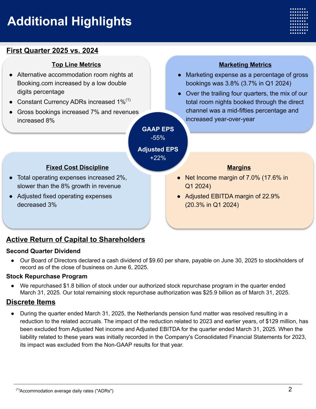 Additional Highlights Active Return of Capital to Shareholders Second Quarter Dividend ● Our Board of Directors declared a cash dividend of $9.60 per share, payable on June 30, 2025 to stockholders of record as of the close of business on June 6, 2025. Stock Repurchase Program ● We repurchased $1.8 billion of stock under our authorized stock repurchase program in the quarter ended March 31, 2025. Our total remaining stock repurchase authorization was $25.9 billion as of March 31, 2025. Discrete Items ● During the quarter ended March 31, 2025, the Netherlands pension fund matter was resolved resulting in a reduction to the related accruals. The impact of the reduction related to 2023 and earlier years, of $129 million, has been excluded from Adjusted Net income and Adjusted EBITDA for the quarter ended March 31, 2025. When the liability related to these years was initially recorded in the Company's Consolidated Financial Statements for 2023, its impact was excluded from the Non-GAAP results for that year. First Quarter 2025 vs. 2024 2 Top Line Metrics ● Alternative accommodation room nights at Booking.com increased by a low double digits percentage ● Constant Currency ADRs increased 1%(1) ● Gross bookings increased 7% and revenues increased 8% Margins ● Net Income margin of 7.0% (17.6% in Q1 2024) ● Adjusted EBITDA margin of 22.9% (20.3% in Q1 2024) Fixed Cost Discipline ● Total operating expenses increased 2%, slower than the 8% growth in revenue ● Adjusted fixed operating expenses decreased 3% Marketing Metrics ● Marketing expense as a percentage of gross bookings was 3.8% (3.7% in Q1 2024) ● Over the trailing four quarters, the mix of our total room nights booked through the direct channel was a mid-fifties percentage and increased year-over-year GAAP EPS -55% Adjusted EPS +22% (1)Accommodation average daily rates ("ADRs")