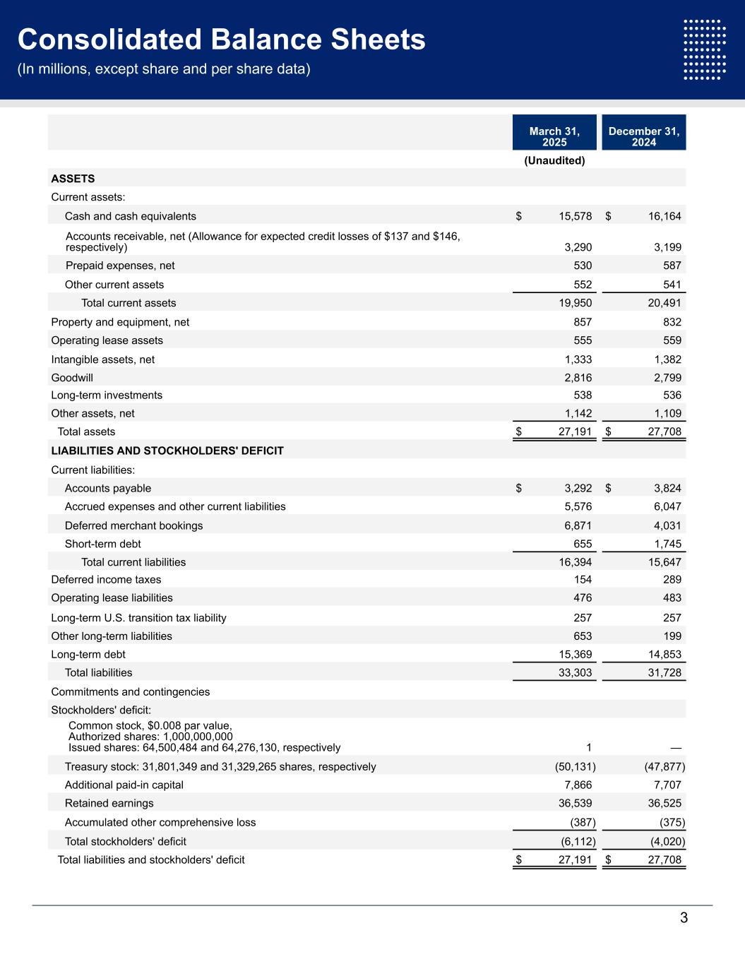 Consolidated Balance Sheets (In millions, except share and per share data) March 31, 2025 December 31, 2024 (Unaudited) ASSETS Current assets: Cash and cash equivalents $ 15,578 $ 16,164 Accounts receivable, net (Allowance for expected credit losses of $137 and $146, respectively) 3,290 3,199 Prepaid expenses, net 530 587 Other current assets 552 541 Total current assets 19,950 20,491 Property and equipment, net 857 832 Operating lease assets 555 559 Intangible assets, net 1,333 1,382 Goodwill 2,816 2,799 Long-term investments 538 536 Other assets, net 1,142 1,109 Total assets $ 27,191 $ 27,708 LIABILITIES AND STOCKHOLDERS' DEFICIT Current liabilities: Accounts payable $ 3,292 $ 3,824 Accrued expenses and other current liabilities 5,576 6,047 Deferred merchant bookings 6,871 4,031 Short-term debt 655 1,745 Total current liabilities 16,394 15,647 Deferred income taxes 154 289 Operating lease liabilities 476 483 Long-term U.S. transition tax liability 257 257 Other long-term liabilities 653 199 Long-term debt 15,369 14,853 Total liabilities 33,303 31,728 Commitments and contingencies Stockholders' deficit: Common stock, $0.008 par value, Authorized shares: 1,000,000,000 Issued shares: 64,500,484 and 64,276,130, respectively 1 — Treasury stock: 31,801,349 and 31,329,265 shares, respectively (50,131) (47,877) Additional paid-in capital 7,866 7,707 Retained earnings 36,539 36,525 Accumulated other comprehensive loss (387) (375) Total stockholders' deficit (6,112) (4,020) Total liabilities and stockholders' deficit $ 27,191 $ 27,708 3