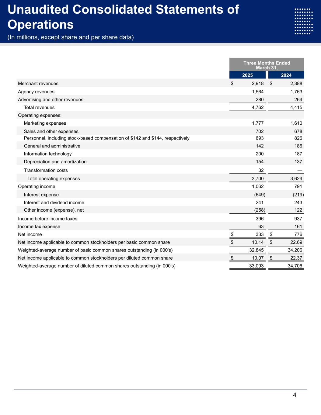 Unaudited Consolidated Statements of Operations (In millions, except share and per share data) Three Months Ended March 31, 2025 2024 Merchant revenues $ 2,918 $ 2,388 Agency revenues 1,564 1,763 Advertising and other revenues 280 264 Total revenues 4,762 4,415 Operating expenses: Marketing expenses 1,777 1,610 Sales and other expenses 702 678 Personnel, including stock-based compensation of $142 and $144, respectively 693 826 General and administrative 142 186 Information technology 200 187 Depreciation and amortization 154 137 Transformation costs 32 — Total operating expenses 3,700 3,624 Operating income 1,062 791 Interest expense (649) (219) Interest and dividend income 241 243 Other income (expense), net (258) 122 Income before income taxes 396 937 Income tax expense 63 161 Net income $ 333 $ 776 Net income applicable to common stockholders per basic common share $ 10.14 $ 22.69 Weighted-average number of basic common shares outstanding (in 000's) 32,845 34,206 Net income applicable to common stockholders per diluted common share $ 10.07 $ 22.37 Weighted-average number of diluted common shares outstanding (in 000's) 33,093 34,706 4