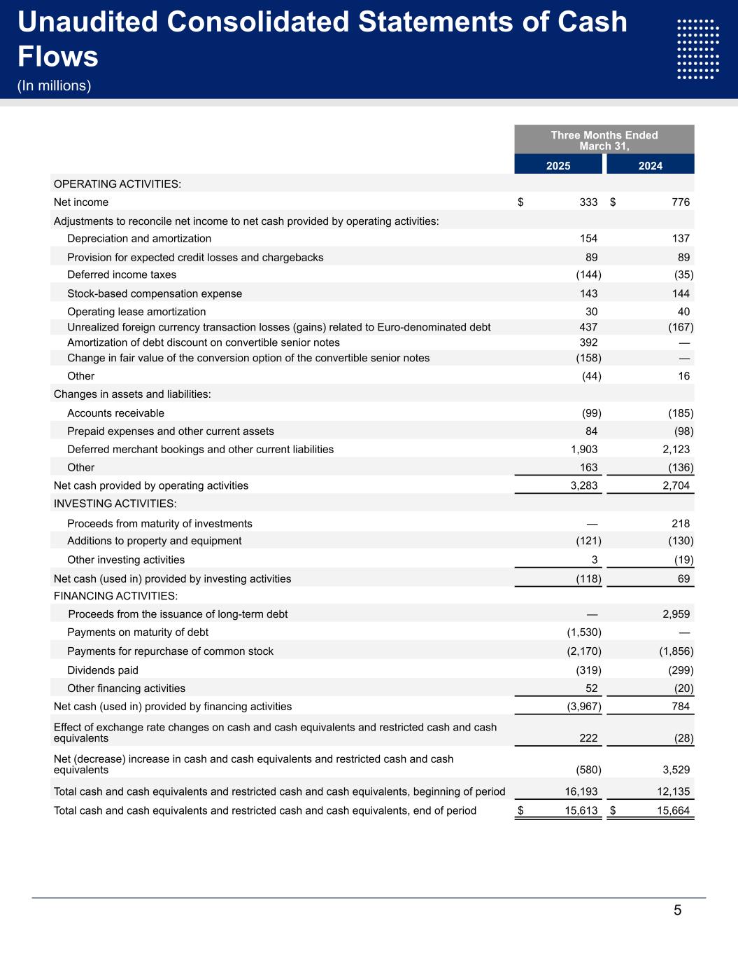 Unaudited Consolidated Statements of Cash Flows (In millions) Three Months Ended March 31, 2025 2024 OPERATING ACTIVITIES: Net income $ 333 $ 776 Adjustments to reconcile net income to net cash provided by operating activities: Depreciation and amortization 154 137 Provision for expected credit losses and chargebacks 89 89 Deferred income taxes (144) (35) Stock-based compensation expense 143 144 Operating lease amortization 30 40 Unrealized foreign currency transaction losses (gains) related to Euro-denominated debt 437 (167) Amortization of debt discount on convertible senior notes 392 — Change in fair value of the conversion option of the convertible senior notes (158) — Other (44) 16 Changes in assets and liabilities: Accounts receivable (99) (185) Prepaid expenses and other current assets 84 (98) Deferred merchant bookings and other current liabilities 1,903 2,123 Other 163 (136) Net cash provided by operating activities 3,283 2,704 INVESTING ACTIVITIES: Proceeds from maturity of investments — 218 Additions to property and equipment (121) (130) Other investing activities 3 (19) Net cash (used in) provided by investing activities (118) 69 FINANCING ACTIVITIES: Proceeds from the issuance of long-term debt — 2,959 Payments on maturity of debt (1,530) — Payments for repurchase of common stock (2,170) (1,856) Dividends paid (319) (299) Other financing activities 52 (20) Net cash (used in) provided by financing activities (3,967) 784 Effect of exchange rate changes on cash and cash equivalents and restricted cash and cash equivalents 222 (28) Net (decrease) increase in cash and cash equivalents and restricted cash and cash equivalents (580) 3,529 Total cash and cash equivalents and restricted cash and cash equivalents, beginning of period 16,193 12,135 Total cash and cash equivalents and restricted cash and cash equivalents, end of period $ 15,613 $ 15,664 5