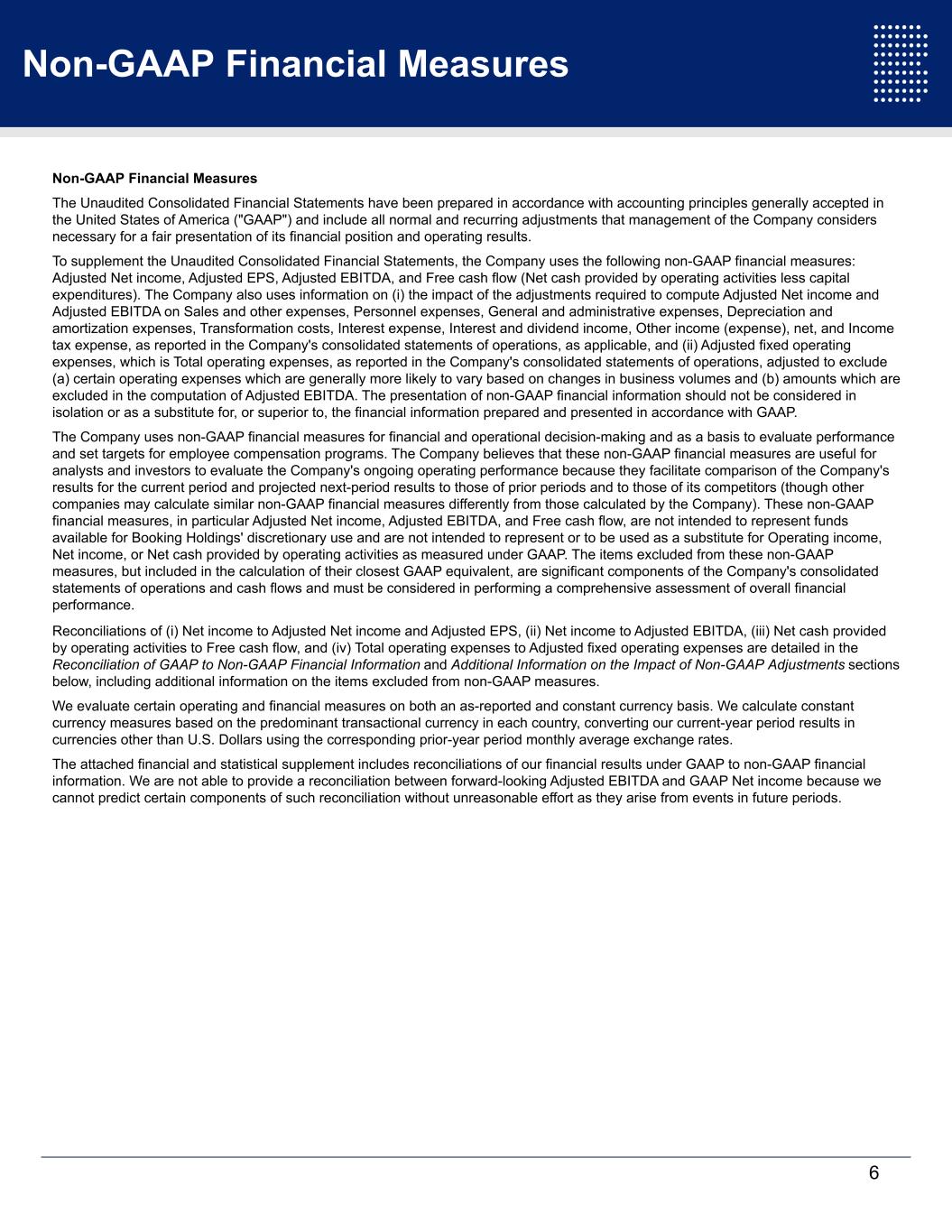 Non-GAAP Financial Measures Non-GAAP Financial Measures The Unaudited Consolidated Financial Statements have been prepared in accordance with accounting principles generally accepted in the United States of America ("GAAP") and include all normal and recurring adjustments that management of the Company considers necessary for a fair presentation of its financial position and operating results. To supplement the Unaudited Consolidated Financial Statements, the Company uses the following non-GAAP financial measures: Adjusted Net income, Adjusted EPS, Adjusted EBITDA, and Free cash flow (Net cash provided by operating activities less capital expenditures). The Company also uses information on (i) the impact of the adjustments required to compute Adjusted Net income and Adjusted EBITDA on Sales and other expenses, Personnel expenses, General and administrative expenses, Depreciation and amortization expenses, Transformation costs, Interest expense, Interest and dividend income, Other income (expense), net, and Income tax expense, as reported in the Company's consolidated statements of operations, as applicable, and (ii) Adjusted fixed operating expenses, which is Total operating expenses, as reported in the Company's consolidated statements of operations, adjusted to exclude (a) certain operating expenses which are generally more likely to vary based on changes in business volumes and (b) amounts which are excluded in the computation of Adjusted EBITDA. The presentation of non-GAAP financial information should not be considered in isolation or as a substitute for, or superior to, the financial information prepared and presented in accordance with GAAP. The Company uses non-GAAP financial measures for financial and operational decision-making and as a basis to evaluate performance and set targets for employee compensation programs. The Company believes that these non-GAAP financial measures are useful for analysts and investors to evaluate the Company's ongoing operating performance because they facilitate comparison of the Company's results for the current period and projected next-period results to those of prior periods and to those of its competitors (though other companies may calculate similar non-GAAP financial measures differently from those calculated by the Company). These non-GAAP financial measures, in particular Adjusted Net income, Adjusted EBITDA, and Free cash flow, are not intended to represent funds available for Booking Holdings' discretionary use and are not intended to represent or to be used as a substitute for Operating income, Net income, or Net cash provided by operating activities as measured under GAAP. The items excluded from these non-GAAP measures, but included in the calculation of their closest GAAP equivalent, are significant components of the Company's consolidated statements of operations and cash flows and must be considered in performing a comprehensive assessment of overall financial performance. Reconciliations of (i) Net income to Adjusted Net income and Adjusted EPS, (ii) Net income to Adjusted EBITDA, (iii) Net cash provided by operating activities to Free cash flow, and (iv) Total operating expenses to Adjusted fixed operating expenses are detailed in the Reconciliation of GAAP to Non-GAAP Financial Information and Additional Information on the Impact of Non-GAAP Adjustments sections below, including additional information on the items excluded from non-GAAP measures. We evaluate certain operating and financial measures on both an as-reported and constant currency basis. We calculate constant currency measures based on the predominant transactional currency in each country, converting our current-year period results in currencies other than U.S. Dollars using the corresponding prior-year period monthly average exchange rates. The attached financial and statistical supplement includes reconciliations of our financial results under GAAP to non-GAAP financial information. We are not able to provide a reconciliation between forward-looking Adjusted EBITDA and GAAP Net income because we cannot predict certain components of such reconciliation without unreasonable effort as they arise from events in future periods. 6