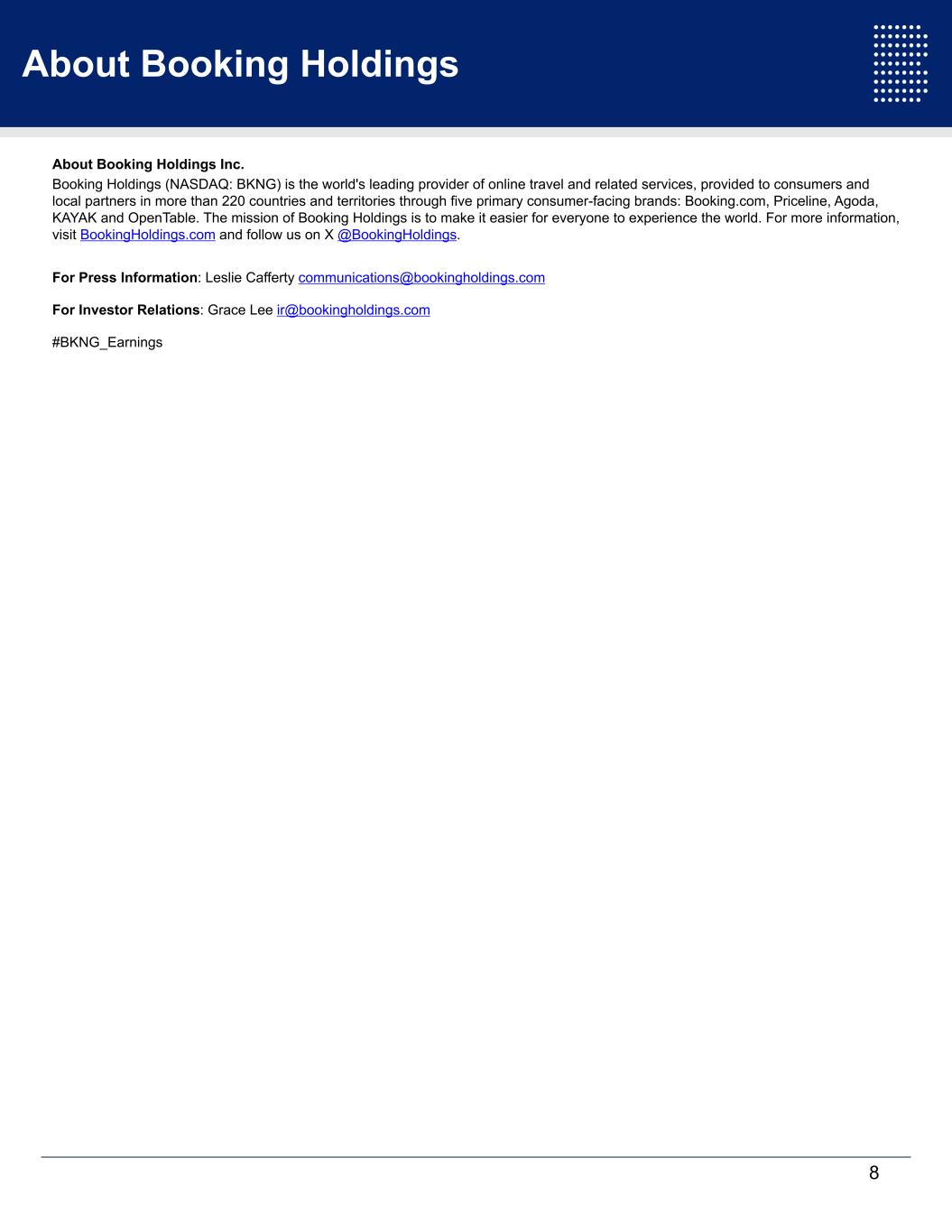 About Booking Holdings About Booking Holdings Inc. Booking Holdings (NASDAQ: BKNG) is the world's leading provider of online travel and related services, provided to consumers and local partners in more than 220 countries and territories through five primary consumer-facing brands: Booking.com, Priceline, Agoda, KAYAK and OpenTable. The mission of Booking Holdings is to make it easier for everyone to experience the world. For more information, visit BookingHoldings.com and follow us on X @BookingHoldings. For Press Information: Leslie Cafferty communications@bookingholdings.com For Investor Relations: Grace Lee ir@bookingholdings.com #BKNG_Earnings 8
