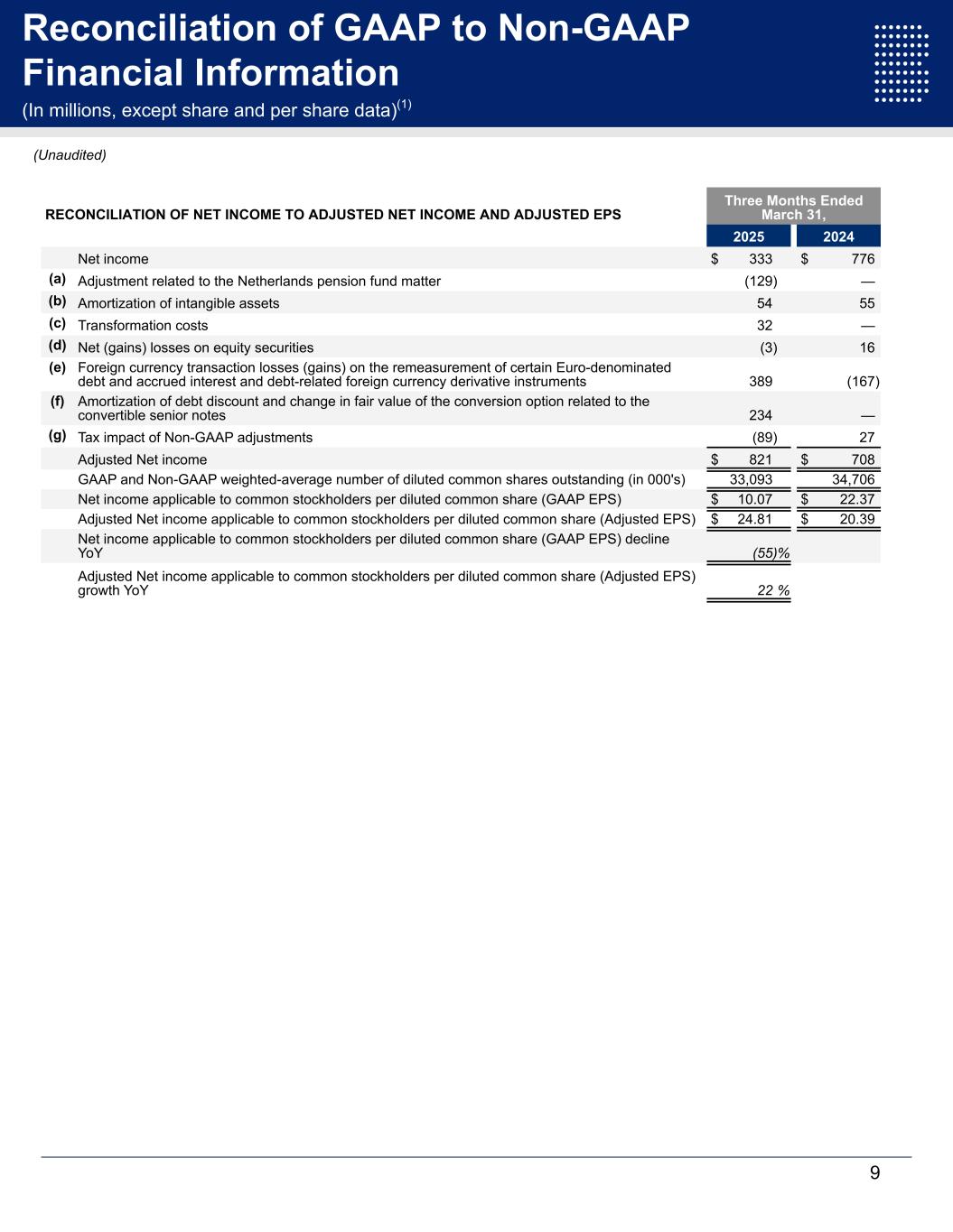 Reconciliation of GAAP to Non-GAAP Financial Information (In millions, except share and per share data)(1) RECONCILIATION OF NET INCOME TO ADJUSTED NET INCOME AND ADJUSTED EPS Three Months Ended March 31, 2025 2024 Net income $ 333 $ 776 (a) Adjustment related to the Netherlands pension fund matter (129) — (b) Amortization of intangible assets 54 55 (c) Transformation costs 32 — (d) Net (gains) losses on equity securities (3) 16 (e) Foreign currency transaction losses (gains) on the remeasurement of certain Euro-denominated debt and accrued interest and debt-related foreign currency derivative instruments 389 (167) (f) Amortization of debt discount and change in fair value of the conversion option related to the convertible senior notes 234 — (g) Tax impact of Non-GAAP adjustments (89) 27 Adjusted Net income $ 821 $ 708 GAAP and Non-GAAP weighted-average number of diluted common shares outstanding (in 000's) 33,093 34,706 Net income applicable to common stockholders per diluted common share (GAAP EPS) $ 10.07 $ 22.37 Adjusted Net income applicable to common stockholders per diluted common share (Adjusted EPS) $ 24.81 $ 20.39 Net income applicable to common stockholders per diluted common share (GAAP EPS) decline YoY (55) % Adjusted Net income applicable to common stockholders per diluted common share (Adjusted EPS) growth YoY 22 % 9 (Unaudited)