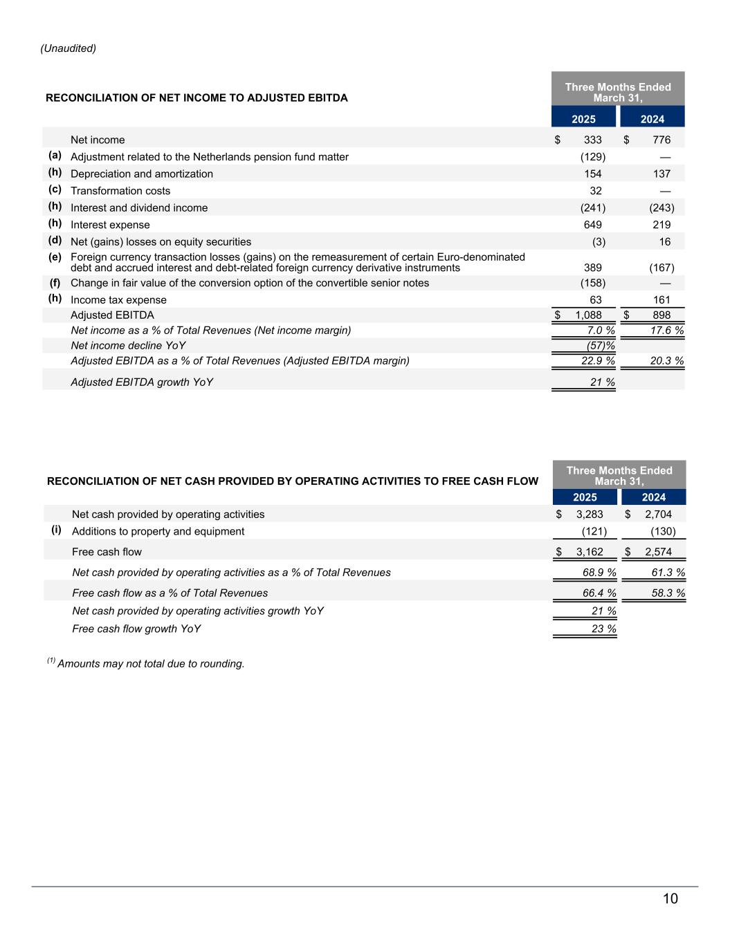 RECONCILIATION OF NET INCOME TO ADJUSTED EBITDA Three Months Ended March 31, 2025 2024 Net income $ 333 $ 776 (a) Adjustment related to the Netherlands pension fund matter (129) — (h) Depreciation and amortization 154 137 (c) Transformation costs 32 — (h) Interest and dividend income (241) (243) (h) Interest expense 649 219 (d) Net (gains) losses on equity securities (3) 16 (e) Foreign currency transaction losses (gains) on the remeasurement of certain Euro-denominated debt and accrued interest and debt-related foreign currency derivative instruments 389 (167) (f) Change in fair value of the conversion option of the convertible senior notes (158) — (h) Income tax expense 63 161 Adjusted EBITDA $ 1,088 $ 898 Net income as a % of Total Revenues (Net income margin) 7.0 % 17.6 % Net income decline YoY (57) % Adjusted EBITDA as a % of Total Revenues (Adjusted EBITDA margin) 22.9 % 20.3 % Adjusted EBITDA growth YoY 21 % RECONCILIATION OF NET CASH PROVIDED BY OPERATING ACTIVITIES TO FREE CASH FLOW Three Months Ended March 31, 2025 2024 Net cash provided by operating activities $ 3,283 $ 2,704 (i) Additions to property and equipment (121) (130) Free cash flow $ 3,162 $ 2,574 Net cash provided by operating activities as a % of Total Revenues 68.9 % 61.3 % Free cash flow as a % of Total Revenues 66.4 % 58.3 % Net cash provided by operating activities growth YoY 21 % Free cash flow growth YoY 23 % (1) Amounts may not total due to rounding. 10 (Unaudited)