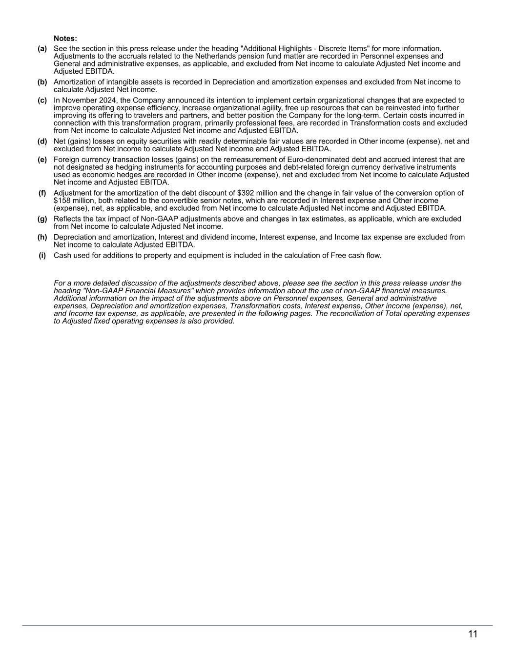 Notes: (a) See the section in this press release under the heading "Additional Highlights - Discrete Items" for more information. Adjustments to the accruals related to the Netherlands pension fund matter are recorded in Personnel expenses and General and administrative expenses, as applicable, and excluded from Net income to calculate Adjusted Net income and Adjusted EBITDA. (b) Amortization of intangible assets is recorded in Depreciation and amortization expenses and excluded from Net income to calculate Adjusted Net income. (c) In November 2024, the Company announced its intention to implement certain organizational changes that are expected to improve operating expense efficiency, increase organizational agility, free up resources that can be reinvested into further improving its offering to travelers and partners, and better position the Company for the long-term. Certain costs incurred in connection with this transformation program, primarily professional fees, are recorded in Transformation costs and excluded from Net income to calculate Adjusted Net income and Adjusted EBITDA. (d) Net (gains) losses on equity securities with readily determinable fair values are recorded in Other income (expense), net and excluded from Net income to calculate Adjusted Net income and Adjusted EBITDA. (e) Foreign currency transaction losses (gains) on the remeasurement of Euro-denominated debt and accrued interest that are not designated as hedging instruments for accounting purposes and debt-related foreign currency derivative instruments used as economic hedges are recorded in Other income (expense), net and excluded from Net income to calculate Adjusted Net income and Adjusted EBITDA. (f) Adjustment for the amortization of the debt discount of $392 million and the change in fair value of the conversion option of $158 million, both related to the convertible senior notes, which are recorded in Interest expense and Other income (expense), net, as applicable, and excluded from Net income to calculate Adjusted Net income and Adjusted EBITDA. (g) Reflects the tax impact of Non-GAAP adjustments above and changes in tax estimates, as applicable, which are excluded from Net income to calculate Adjusted Net income. (h) Depreciation and amortization, Interest and dividend income, Interest expense, and Income tax expense are excluded from Net income to calculate Adjusted EBITDA. (i) Cash used for additions to property and equipment is included in the calculation of Free cash flow. For a more detailed discussion of the adjustments described above, please see the section in this press release under the heading "Non-GAAP Financial Measures" which provides information about the use of non-GAAP financial measures. Additional information on the impact of the adjustments above on Personnel expenses, General and administrative expenses, Depreciation and amortization expenses, Transformation costs, Interest expense, Other income (expense), net, and Income tax expense, as applicable, are presented in the following pages. The reconciliation of Total operating expenses to Adjusted fixed operating expenses is also provided. 11