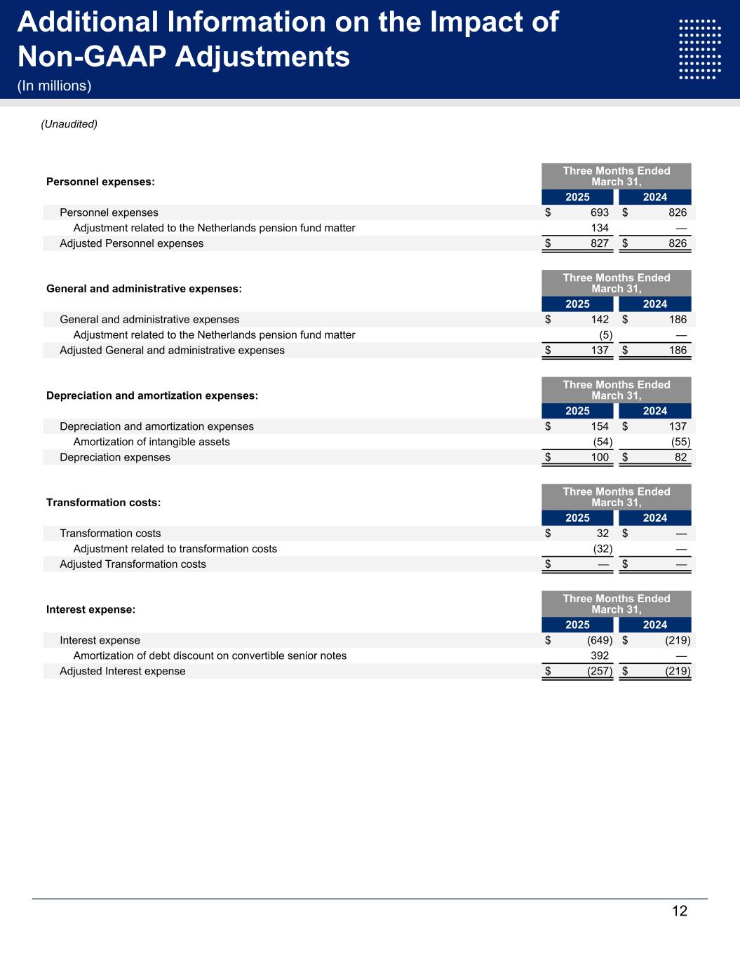 Additional Information on the Impact of Non-GAAP Adjustments (In millions) Personnel expenses: Three Months Ended March 31, 2025 2024 Personnel expenses $ 693 $ 826 Adjustment related to the Netherlands pension fund matter 134 — Adjusted Personnel expenses $ 827 $ 826 General and administrative expenses: Three Months Ended March 31, 2025 2024 General and administrative expenses $ 142 $ 186 Adjustment related to the Netherlands pension fund matter (5) — Adjusted General and administrative expenses $ 137 $ 186 Depreciation and amortization expenses: Three Months Ended March 31, 2025 2024 Depreciation and amortization expenses $ 154 $ 137 Amortization of intangible assets (54) (55) Depreciation expenses $ 100 $ 82 Transformation costs: Three Months Ended March 31, 2025 2024 Transformation costs $ 32 $ — Adjustment related to transformation costs (32) — Adjusted Transformation costs $ — $ — Interest expense: Three Months Ended March 31, 2025 2024 Interest expense $ (649) $ (219) Amortization of debt discount on convertible senior notes 392 — Adjusted Interest expense $ (257) $ (219) 12 (Unaudited)