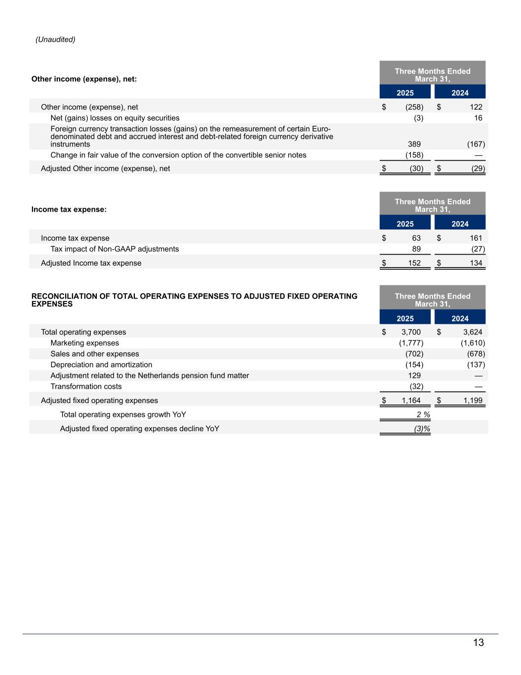 Other income (expense), net: Three Months Ended March 31, 2025 2024 Other income (expense), net $ (258) $ 122 Net (gains) losses on equity securities (3) 16 Foreign currency transaction losses (gains) on the remeasurement of certain Euro- denominated debt and accrued interest and debt-related foreign currency derivative instruments 389 (167) Change in fair value of the conversion option of the convertible senior notes (158) — Adjusted Other income (expense), net $ (30) $ (29) Income tax expense: Three Months Ended March 31, 2025 2024 Income tax expense $ 63 $ 161 Tax impact of Non-GAAP adjustments 89 (27) Adjusted Income tax expense $ 152 $ 134 RECONCILIATION OF TOTAL OPERATING EXPENSES TO ADJUSTED FIXED OPERATING EXPENSES Three Months Ended March 31, 2025 2024 Total operating expenses $ 3,700 $ 3,624 Marketing expenses (1,777) (1,610) Sales and other expenses (702) (678) Depreciation and amortization (154) (137) Adjustment related to the Netherlands pension fund matter 129 — Transformation costs (32) — Adjusted fixed operating expenses $ 1,164 $ 1,199 Total operating expenses growth YoY 2 % Adjusted fixed operating expenses decline YoY (3) % 13 (Unaudited)