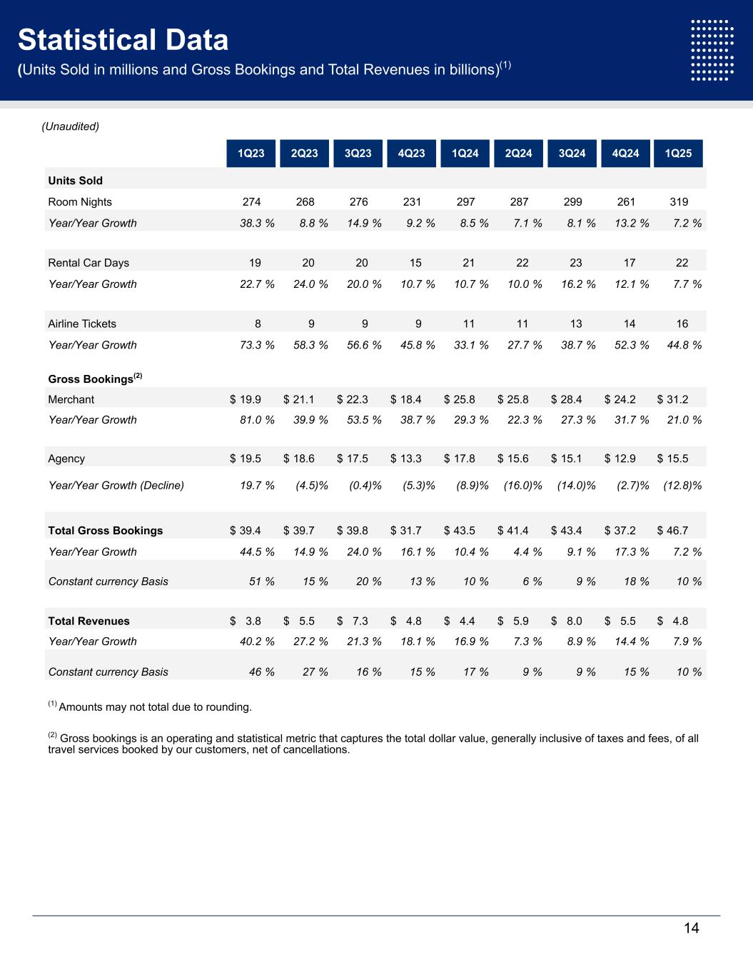 Statistical Data (Units Sold in millions and Gross Bookings and Total Revenues in billions)(1) 1Q23 2Q23 3Q23 4Q23 1Q24 2Q24 3Q24 4Q24 1Q25 Units Sold Room Nights 274 268 276 231 297 287 299 261 319 Year/Year Growth 38.3 % 8.8 % 14.9 % 9.2 % 8.5 % 7.1 % 8.1 % 13.2 % 7.2 % Rental Car Days 19 20 20 15 21 22 23 17 22 Year/Year Growth 22.7 % 24.0 % 20.0 % 10.7 % 10.7 % 10.0 % 16.2 % 12.1 % 7.7 % Airline Tickets 8 9 9 9 11 11 13 14 16 Year/Year Growth 73.3 % 58.3 % 56.6 % 45.8 % 33.1 % 27.7 % 38.7 % 52.3 % 44.8 % Gross Bookings(2) Merchant $ 19.9 $ 21.1 $ 22.3 $ 18.4 $ 25.8 $ 25.8 $ 28.4 $ 24.2 $ 31.2 Year/Year Growth 81.0 % 39.9 % 53.5 % 38.7 % 29.3 % 22.3 % 27.3 % 31.7 % 21.0 % Agency $ 19.5 $ 18.6 $ 17.5 $ 13.3 $ 17.8 $ 15.6 $ 15.1 $ 12.9 $ 15.5 Year/Year Growth (Decline) 19.7 % (4.5) % (0.4) % (5.3) % (8.9) % (16.0) % (14.0) % (2.7) % (12.8) % Total Gross Bookings $ 39.4 $ 39.7 $ 39.8 $ 31.7 $ 43.5 $ 41.4 $ 43.4 $ 37.2 $ 46.7 Year/Year Growth 44.5 % 14.9 % 24.0 % 16.1 % 10.4 % 4.4 % 9.1 % 17.3 % 7.2 % Constant currency Basis 51 % 15 % 20 % 13 % 10 % 6 % 9 % 18 % 10 % Total Revenues $ 3.8 $ 5.5 $ 7.3 $ 4.8 $ 4.4 $ 5.9 $ 8.0 $ 5.5 $ 4.8 Year/Year Growth 40.2 % 27.2 % 21.3 % 18.1 % 16.9 % 7.3 % 8.9 % 14.4 % 7.9 % Constant currency Basis 46 % 27 % 16 % 15 % 17 % 9 % 9 % 15 % 10 % (1) Amounts may not total due to rounding. (2) Gross bookings is an operating and statistical metric that captures the total dollar value, generally inclusive of taxes and fees, of all travel services booked by our customers, net of cancellations. 14 (Unaudited)