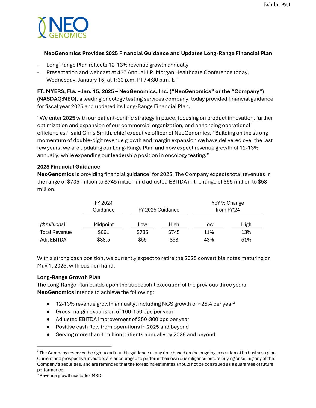 NeoGenomics Provides 2025 Financial Guidance and Updates Long-Range Financial Plan - Long-Range Plan reflects 12-13% revenue growth annually - Presentation and webcast at 43rd Annual J.P. Morgan Healthcare Conference today, Wednesday, January 15, at 1:30 p.m. PT / 4:30 p.m. ET FT. MYERS, Fla. – Jan. 15, 2025 – NeoGenomics, Inc. (“NeoGenomics” or the “Company”) (NASDAQ:NEO), a leading oncology testing services company, today provided financial guidance for fiscal year 2025 and updated its Long-Range Financial Plan. “We enter 2025 with our patient-centric strategy in place, focusing on product innovation, further optimization and expansion of our commercial organization, and enhancing operational efficiencies,” said Chris Smith, chief executive officer of NeoGenomics. “Building on the strong momentum of double-digit revenue growth and margin expansion we have delivered over the last few years, we are updating our Long-Range Plan and now expect revenue growth of 12-13% annually, while expanding our leadership position in oncology testing.” 2025 Financial Guidance NeoGenomics is providing financial guidance1 for 2025. The Company expects total revenues in the range of $735 million to $745 million and adjusted EBITDA in the range of $55 million to $58 million. FY 2024 Guidance FY 2025 Guidance YoY % Change from FY'24 ($ millions) Midpoint Low High Low High Total Revenue $661 $735 $745 11% 13% Adj. EBITDA $38.5 $55 $58 43% 51% With a strong cash position, we currently expect to retire the 2025 convertible notes maturing on May 1, 2025, with cash on hand. Long-Range Growth Plan The Long-Range Plan builds upon the successful execution of the previous three years. NeoGenomics intends to achieve the following: ● 12-13% revenue growth annually, including NGS growth of ~25% per year2 ● Gross margin expansion of 100-150 bps per year ● Adjusted EBITDA improvement of 250-300 bps per year ● Positive cash flow from operations in 2025 and beyond ● Serving more than 1 million patients annually by 2028 and beyond 1 The Company reserves the right to adjust this guidance at any time based on the ongoing execution of its business plan. Current and prospective investors are encouraged to perform their own due diligence before buying or selling any of the Company’s securities, and are reminded that the foregoing estimates should not be construed as a guarantee of future performance. 2 Revenue growth excludes MRD Exhibit 99.1