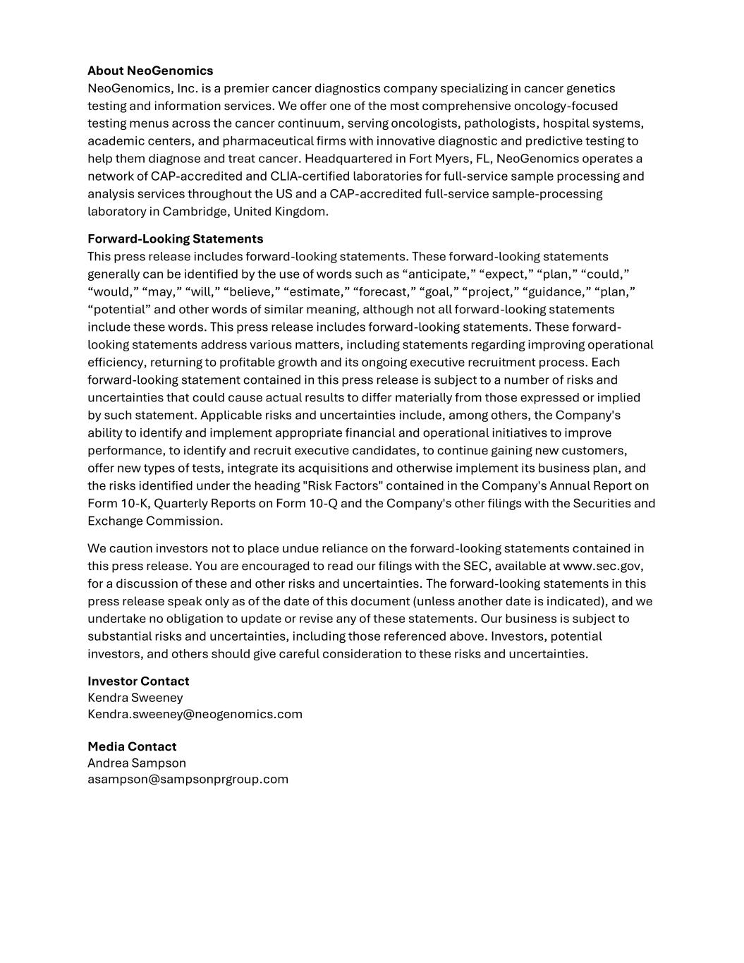 About NeoGenomics NeoGenomics, Inc. is a premier cancer diagnostics company specializing in cancer genetics testing and information services. We offer one of the most comprehensive oncology-focused testing menus across the cancer continuum, serving oncologists, pathologists, hospital systems, academic centers, and pharmaceutical firms with innovative diagnostic and predictive testing to help them diagnose and treat cancer. Headquartered in Fort Myers, FL, NeoGenomics operates a network of CAP-accredited and CLIA-certified laboratories for full-service sample processing and analysis services throughout the US and a CAP-accredited full-service sample-processing laboratory in Cambridge, United Kingdom. Forward-Looking Statements This press release includes forward-looking statements. These forward-looking statements generally can be identified by the use of words such as “anticipate,” “expect,” “plan,” “could,” “would,” “may,” “will,” “believe,” “estimate,” “forecast,” “goal,” “project,” “guidance,” “plan,” “potential” and other words of similar meaning, although not all forward-looking statements include these words. This press release includes forward-looking statements. These forward- looking statements address various matters, including statements regarding improving operational efficiency, returning to profitable growth and its ongoing executive recruitment process. Each forward-looking statement contained in this press release is subject to a number of risks and uncertainties that could cause actual results to differ materially from those expressed or implied by such statement. Applicable risks and uncertainties include, among others, the Company's ability to identify and implement appropriate financial and operational initiatives to improve performance, to identify and recruit executive candidates, to continue gaining new customers, offer new types of tests, integrate its acquisitions and otherwise implement its business plan, and the risks identified under the heading "Risk Factors" contained in the Company's Annual Report on Form 10-K, Quarterly Reports on Form 10-Q and the Company's other filings with the Securities and Exchange Commission. We caution investors not to place undue reliance on the forward-looking statements contained in this press release. You are encouraged to read our filings with the SEC, available at www.sec.gov, for a discussion of these and other risks and uncertainties. The forward-looking statements in this press release speak only as of the date of this document (unless another date is indicated), and we undertake no obligation to update or revise any of these statements. Our business is subject to substantial risks and uncertainties, including those referenced above. Investors, potential investors, and others should give careful consideration to these risks and uncertainties. Investor Contact Kendra Sweeney Kendra.sweeney@neogenomics.com Media Contact Andrea Sampson asampson@sampsonprgroup.com