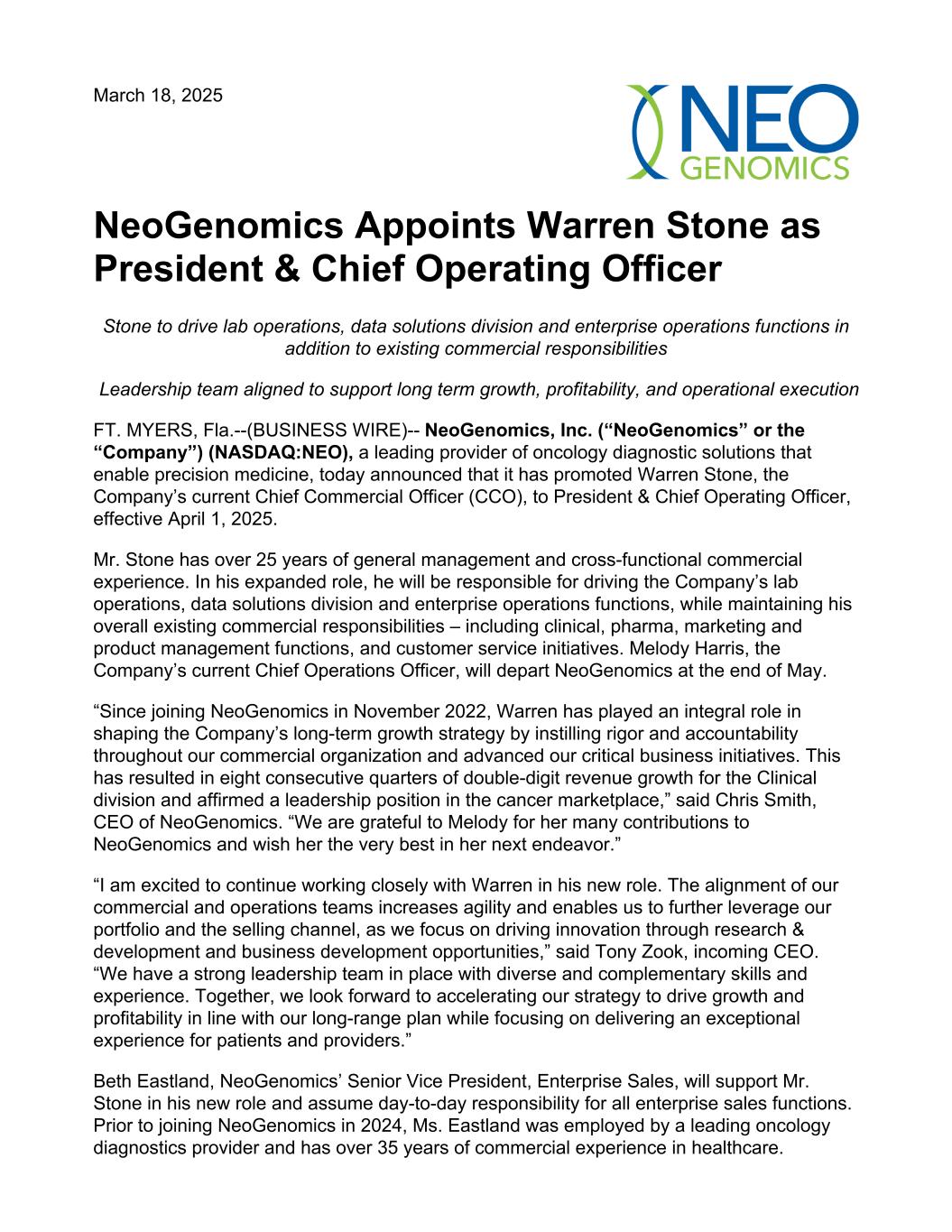 March 18, 2025 NeoGenomics Appoints Warren Stone as President & Chief Operating Officer Stone to drive lab operations, data solutions division and enterprise operations functions in addition to existing commercial responsibilities Leadership team aligned to support long term growth, profitability, and operational execution FT. MYERS, Fla.--(BUSINESS WIRE)-- NeoGenomics, Inc. (“NeoGenomics” or the “Company”) (NASDAQ:NEO), a leading provider of oncology diagnostic solutions that enable precision medicine, today announced that it has promoted Warren Stone, the Company’s current Chief Commercial Officer (CCO), to President & Chief Operating Officer, effective April 1, 2025. Mr. Stone has over 25 years of general management and cross-functional commercial experience. In his expanded role, he will be responsible for driving the Company’s lab operations, data solutions division and enterprise operations functions, while maintaining his overall existing commercial responsibilities – including clinical, pharma, marketing and product management functions, and customer service initiatives. Melody Harris, the Company’s current Chief Operations Officer, will depart NeoGenomics at the end of May. “Since joining NeoGenomics in November 2022, Warren has played an integral role in shaping the Company’s long-term growth strategy by instilling rigor and accountability throughout our commercial organization and advanced our critical business initiatives. This has resulted in eight consecutive quarters of double-digit revenue growth for the Clinical division and affirmed a leadership position in the cancer marketplace,” said Chris Smith, CEO of NeoGenomics. “We are grateful to Melody for her many contributions to NeoGenomics and wish her the very best in her next endeavor.” “I am excited to continue working closely with Warren in his new role. The alignment of our commercial and operations teams increases agility and enables us to further leverage our portfolio and the selling channel, as we focus on driving innovation through research & development and business development opportunities,” said Tony Zook, incoming CEO. “We have a strong leadership team in place with diverse and complementary skills and experience. Together, we look forward to accelerating our strategy to drive growth and profitability in line with our long-range plan while focusing on delivering an exceptional experience for patients and providers.” Beth Eastland, NeoGenomics’ Senior Vice President, Enterprise Sales, will support Mr. Stone in his new role and assume day-to-day responsibility for all enterprise sales functions. Prior to joining NeoGenomics in 2024, Ms. Eastland was employed by a leading oncology diagnostics provider and has over 35 years of commercial experience in healthcare.