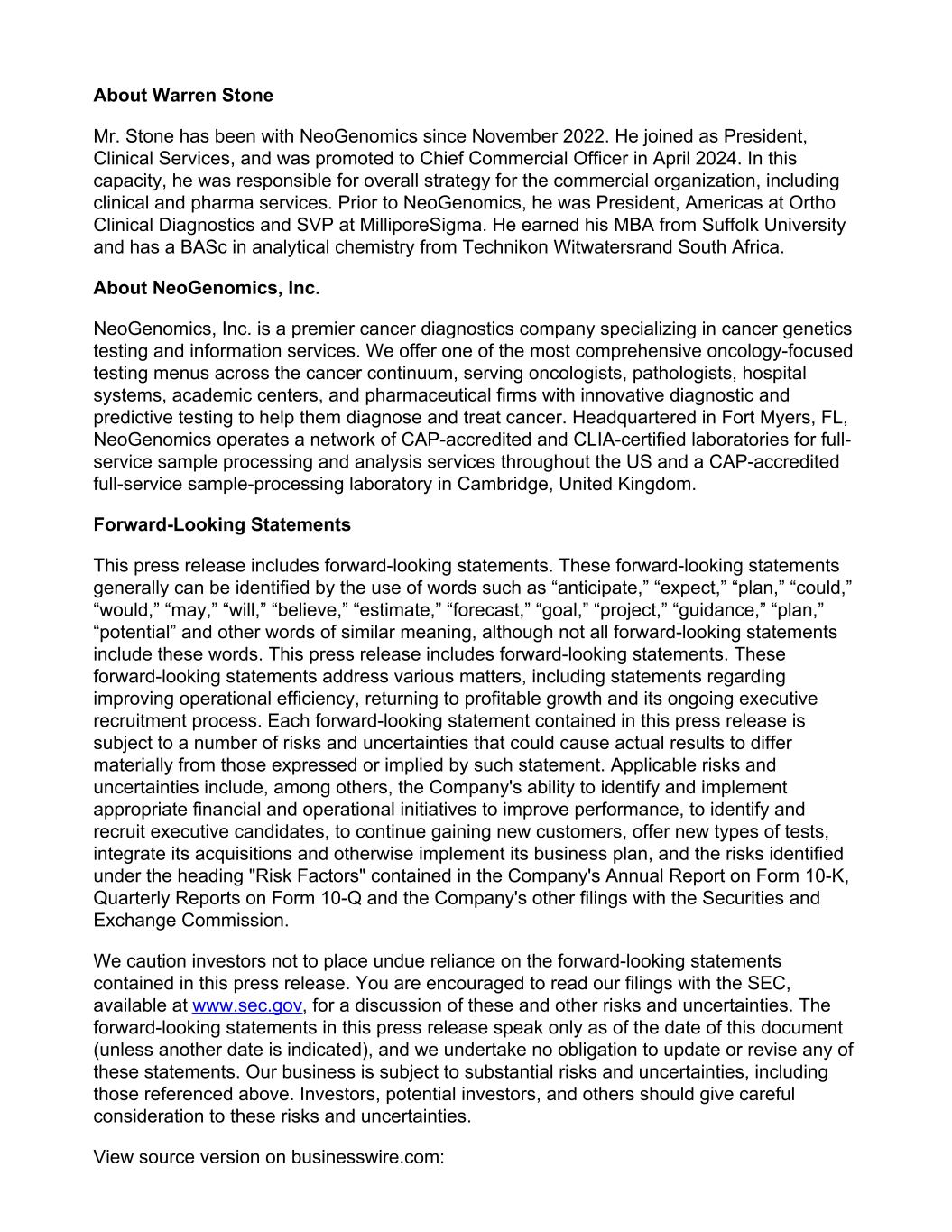 About Warren Stone Mr. Stone has been with NeoGenomics since November 2022. He joined as President, Clinical Services, and was promoted to Chief Commercial Officer in April 2024. In this capacity, he was responsible for overall strategy for the commercial organization, including clinical and pharma services. Prior to NeoGenomics, he was President, Americas at Ortho Clinical Diagnostics and SVP at MilliporeSigma. He earned his MBA from Suffolk University and has a BASc in analytical chemistry from Technikon Witwatersrand South Africa. About NeoGenomics, Inc. NeoGenomics, Inc. is a premier cancer diagnostics company specializing in cancer genetics testing and information services. We offer one of the most comprehensive oncology-focused testing menus across the cancer continuum, serving oncologists, pathologists, hospital systems, academic centers, and pharmaceutical firms with innovative diagnostic and predictive testing to help them diagnose and treat cancer. Headquartered in Fort Myers, FL, NeoGenomics operates a network of CAP-accredited and CLIA-certified laboratories for full- service sample processing and analysis services throughout the US and a CAP-accredited full-service sample-processing laboratory in Cambridge, United Kingdom. Forward-Looking Statements This press release includes forward-looking statements. These forward-looking statements generally can be identified by the use of words such as “anticipate,” “expect,” “plan,” “could,” “would,” “may,” “will,” “believe,” “estimate,” “forecast,” “goal,” “project,” “guidance,” “plan,” “potential” and other words of similar meaning, although not all forward-looking statements include these words. This press release includes forward-looking statements. These forward-looking statements address various matters, including statements regarding improving operational efficiency, returning to profitable growth and its ongoing executive recruitment process. Each forward-looking statement contained in this press release is subject to a number of risks and uncertainties that could cause actual results to differ materially from those expressed or implied by such statement. Applicable risks and uncertainties include, among others, the Company's ability to identify and implement appropriate financial and operational initiatives to improve performance, to identify and recruit executive candidates, to continue gaining new customers, offer new types of tests, integrate its acquisitions and otherwise implement its business plan, and the risks identified under the heading "Risk Factors" contained in the Company's Annual Report on Form 10-K, Quarterly Reports on Form 10-Q and the Company's other filings with the Securities and Exchange Commission. We caution investors not to place undue reliance on the forward-looking statements contained in this press release. You are encouraged to read our filings with the SEC, available at www.sec.gov, for a discussion of these and other risks and uncertainties. The forward-looking statements in this press release speak only as of the date of this document (unless another date is indicated), and we undertake no obligation to update or revise any of these statements. Our business is subject to substantial risks and uncertainties, including those referenced above. Investors, potential investors, and others should give careful consideration to these risks and uncertainties. View source version on businesswire.com: