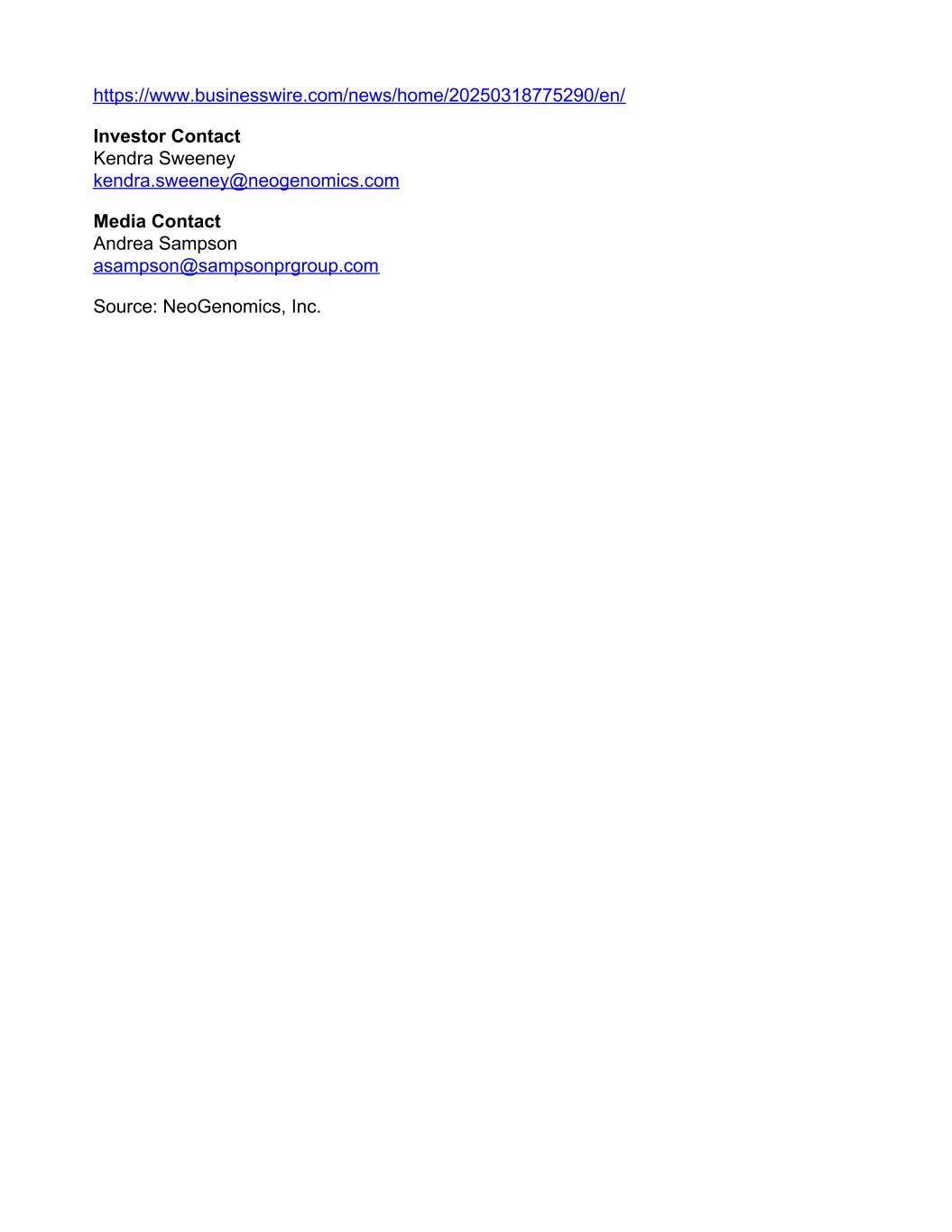 https://www.businesswire.com/news/home/20250318775290/en/ Investor Contact Kendra Sweeney kendra.sweeney@neogenomics.com Media Contact Andrea Sampson asampson@sampsonprgroup.com Source: NeoGenomics, Inc.
