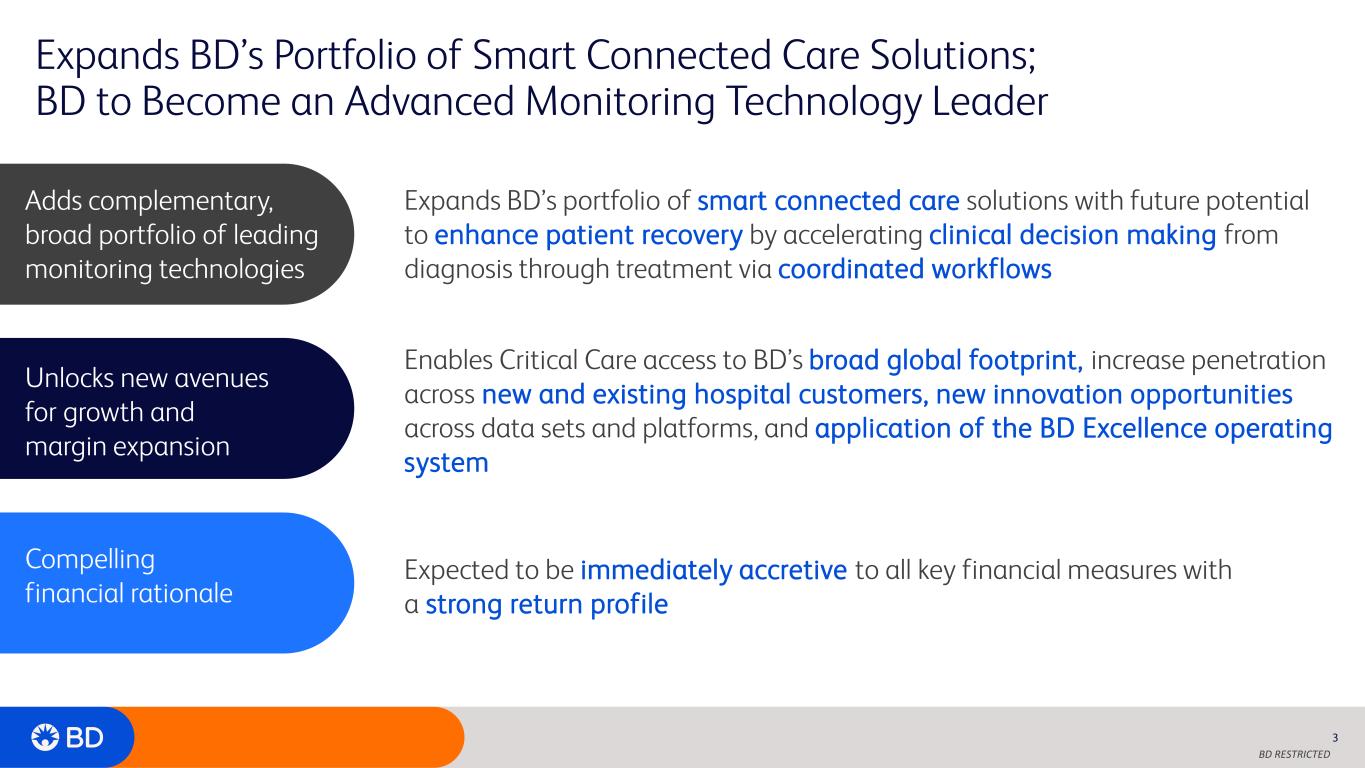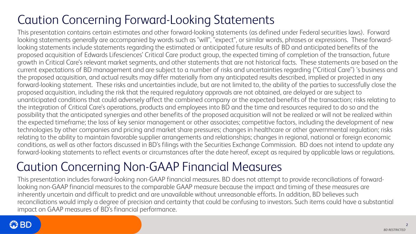 BD RESTRICTED Caution Concerning Forward-Looking Statements This presentation contains certain estimates and other forward-looking statements (as defined under Federal securities laws). Forward looking statements generally are accompanied by words such as "will", "expect", or similar words, phrases or expressions. These forward- looking statements include statements regarding the estimated or anticipated future results of BD and anticipated benefits of the proposed acquisition of Edwards Lifesciences’ Critical Care product group, the expected timing of completion of the transaction, future growth in Critical Care’s relevant market segments, and other statements that are not historical facts. These statements are based on the current expectations of BD management and are subject to a number of risks and uncertainties regarding (“Critical Care”) ’s business and the proposed acquisition, and actual results may differ materially from any anticipated results described, implied or projected in any forward-looking statement. These risks and uncertainties include, but are not limited to, the ability of the parties to successfully close the proposed acquisition, including the risk that the required regulatory approvals are not obtained, are delayed or are subject to unanticipated conditions that could adversely affect the combined company or the expected benefits of the transaction; risks relating to the integration of Critical Care’s operations, products and employees into BD and the time and resources required to do so and the possibility that the anticipated synergies and other benefits of the proposed acquisition will not be realized or will not be realized within the expected timeframe; the loss of key senior management or other associates; competitive factors, including the development of new technologies by other companies and pricing and market share pressures; changes in healthcare or other governmental regulation; risks relating to the ability to maintain favorable supplier arrangements and relationships; changes in regional, national or foreign economic conditions, as well as other factors discussed in BD's filings with the Securities Exchange Commission. BD does not intend to update any forward-looking statements to reflect events or circumstances after the date hereof, except as required by applicable laws or regulations. 2 Caution Concerning Non-GAAP Financial Measures This presentation includes forward-looking non-GAAP financial measures. BD does not attempt to provide reconciliations of forward- looking non-GAAP financial measures to the comparable GAAP measure because the impact and timing of these measures are inherently uncertain and difficult to predict and are unavailable without unreasonable efforts. In addition, BD believes such reconciliations would imply a degree of precision and certainty that could be confusing to investors. Such items could have a substantial impact on GAAP measures of BD's financial performance.