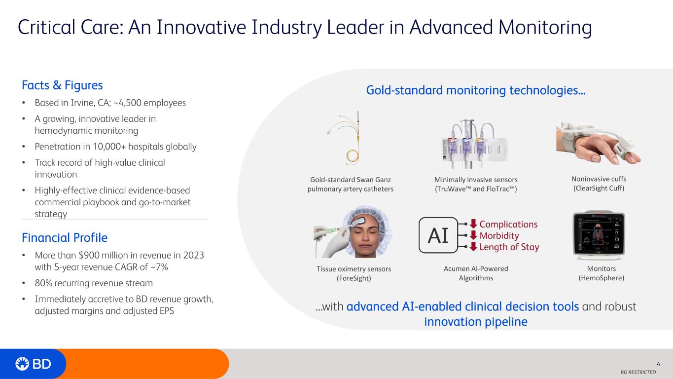 BD RESTRICTED Expands BD’s Portfolio of Smart Connected Care Solutions; BD to Become an Advanced Monitoring Technology Leader 3 Expands BD’s portfolio of smart connected care solutions with future potential to enhance patient recovery by accelerating clinical decision making from diagnosis through treatment via coordinated workflows Enables Critical Care access to BD’s broad global footprint, increase penetration across new and existing hospital customers, new innovation opportunities across data sets and platforms, and application of the BD Excellence operating system Expected to be immediately accretive to all key financial measures with a strong return profile Adds complementary, broad portfolio of leading monitoring technologies Unlocks new avenues for growth and margin expansion Compelling financial rationale
