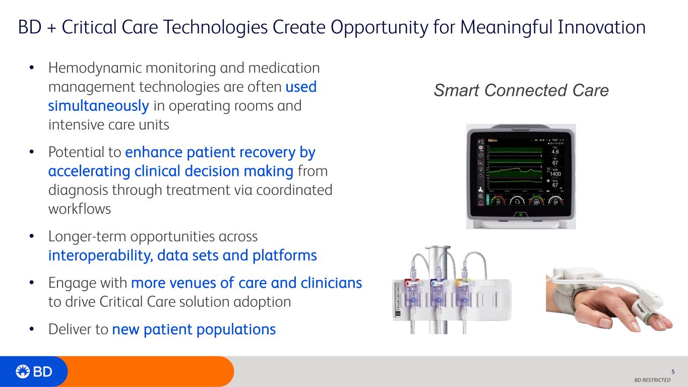 BD RESTRICTED Critical Care: An Innovative Industry Leader in Advanced Monitoring 4 Gold-standard monitoring technologies… …with advanced AI-enabled clinical decision tools and robust innovation pipeline Facts & Figures • Based in Irvine, CA; ~4,500 employees • A growing, innovative leader in hemodynamic monitoring • Penetration in 10,000+ hospitals globally • Track record of high-value clinical innovation • Highly-effective clinical evidence-based commercial playbook and go-to-market strategy Financial Profile • More than $900 million in revenue in 2023 with 5-year revenue CAGR of ~7% • 80% recurring revenue stream • Immediately accretive to BD revenue growth, adjusted margins and adjusted EPS Minimally invasive sensors (TruWave and FloTrac ) Acumen AI-Powered Algorithms Gold-standard Swan Ganz pulmonary artery catheters Noninvasive cuffs (ClearSight Cuff) Monitors (HemoSphere) Tissue oximetry sensors (ForeSight)