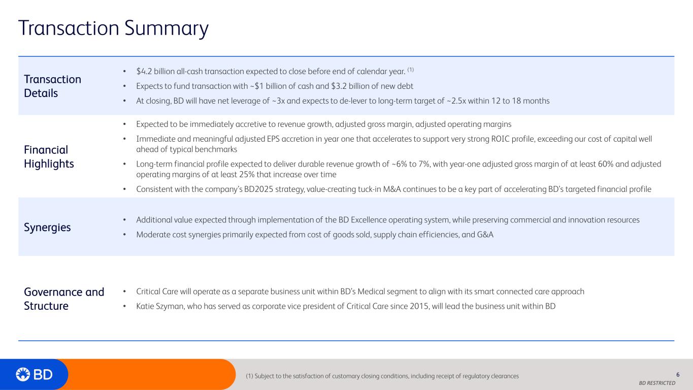 BD RESTRICTED BD + Critical Care Technologies Create Opportunity for Meaningful Innovation 5 • Hemodynamic monitoring and medication management technologies are often used simultaneously in operating rooms and intensive care units • Potential to enhance patient recovery by accelerating clinical decision making from diagnosis through treatment via coordinated workflows • Longer-term opportunities across interoperability, data sets and platforms • Engage with more venues of care and clinicians to drive Critical Care solution adoption • Deliver to new patient populations Smart Connected Care