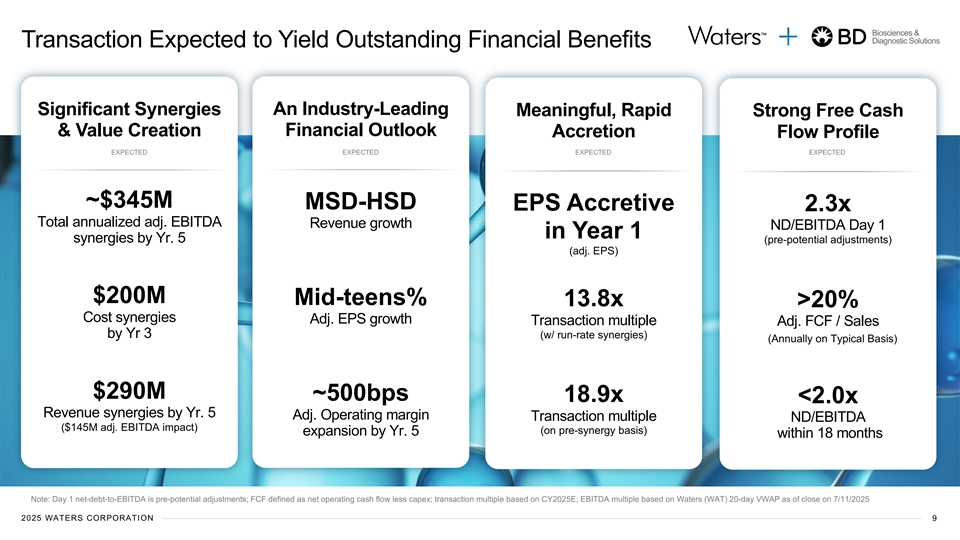 Bi Bio osci scie en nce ces s & & Dia Diag gn no os st tic ic S So olu lut tio ion ns s An Industry Leading Financial Outlook Biosciences & Diagnostic Solutions Biosciences & SYNERGIES Diagnostic Solutions ~ MSD+ MSD-HSD $290M + Historic Sales Growth Expected Revenue Synergies Near-To-Mid-Term Expected Sales Growth Commercial Excellence High-Growth Adjacencies Cross-Selling + ($145M EBITDA impact) Biosciences & Diagnostic Solutions +500 bps ~ ~ $200M 27% Adjusted Operating Margin Expansion Expected Cost Synergies Expected by 2030 Starting Adj. Operating Margin (CY 2025 Estimate) Mid-Teens Adj. EPS Growth (Expected 2025-30) Expected to be Accretive within 1st Year 2025 WATERS CORPORATION 8