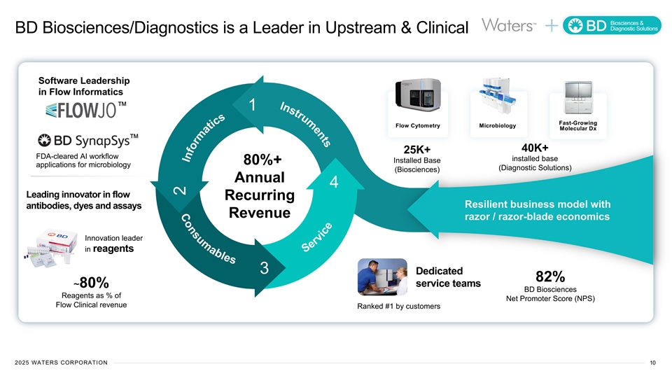 Biosciences & Diagnostic Solutions Transaction Expected to Yield Outstanding Financial Benefits An Industry-Leading Significant Synergies Meaningful, Rapid Strong Free Cash & Value Creation Financial Outlook Accretion Flow Profile EXPECTED EXPECTED EXPECTED EXPECTED ~$345M MSD-HSD EPS Accretive 2.3x Total annualized adj. EBITDA Revenue growth ND/EBITDA Day 1 in Year 1 synergies by Yr. 5 (pre-potential adjustments) (adj. EPS) $200M Mid-teens% 13.8x >20% Cost synergies Adj. EPS growth Transaction multiple Adj. FCF / Sales by Yr 3 (w/ run-rate synergies) (Annually on Typical Basis) $290M ~500bps 18.9x <2.0x Revenue synergies by Yr. 5 Adj. Operating margin Transaction multiple ND/EBITDA ($145M adj. EBITDA impact) (on pre-synergy basis) expansion by Yr. 5 within 18 months Note: Day 1 net-debt-to-EBITDA is pre-potential adjustments; FCF defined as net operating cash flow less capex; transaction multiple based on CY2025E; EBITDA multiple based on Waters (WAT) 20-day VWAP as of close on 7/11/2025 2025 WATERS CORPORATION 9