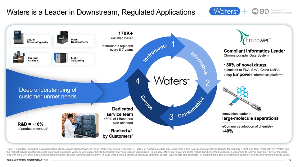 Biosciences & Diagnostic Solutions Attractive Financial Profile & Business Mix Product Type Geography Innovative portfolio and highly differentiated capabilities in attractive end-markets Service China 10% LATAM Single Cell Microbiology 13% 5% Multiomics 35% APAC 1% 10% Well-established in Strong investment 1 attractive $22B TAM in R&D supports a leading 100k+ flow cytometry users; innovation position cited in 125K+ publications Flow Cytometry North Molecular EMEA 37% Point of America 13% 29% Care 43% 4% Attractive growth, mix & margin profile expected MSD+ 80%+ ~26% $3.4B 2 Total GAAP Revenue (FY24) market growth recurring revenue adj. EBITDA margin (FY24) Note: 1. Addressable markets based on internal BD estimates; category growths represent normalized expected future market growth rates based on internal BD estimates. 2. Market growth profile on weighted average basis within TAM. FY represents BD Biosciences/Dx FY ending 9/30 for purposes of this page and where #s may not tie due to rounding 2025 WATERS CORPORATION 12