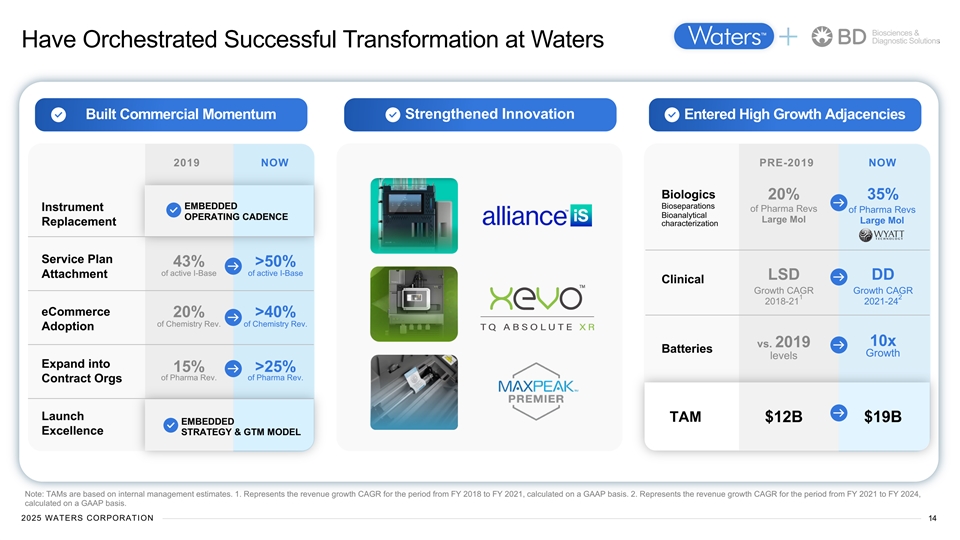 Biosciences & Diagnostic Solutions Waters is a Leader in Downstream, Regulated Applications 170K+ 4 installed base Liquid Mass Chromatography Spectrometry Instruments replaced 1 every 5-7 years Compliant Informatics Leader Chromatography Data System Thermal Light Analysis Scattering ~80% of novel drugs submitted to FDA, EMA, China NMPA 3 using Empower informatics platform 4 2 Deep understanding of customer unmet needs Dedicated Innovation leader in service team >50% of I-Base has 3 large-molecule separations plan attached R&D = ~10% eCommerce adoption of chemistry 1 of product revenues Ranked #1 >40% 2 by Customers Note: 1. Total R&D spending as a percentage of non-service total company revenue for the year ended December 31, 2024. 2. According to SDi 2024 Analytical & Life Science Instrumentation Service Market (2021-2024 End User Perspectives), Waters has the highest service satisfaction score among all instrument vendors, while according to Technology Services Industry Association (TSIA), 2024 tNPS score over 20 points higher than benchmark average. 3. According to internal analysis, ~80% of the drugs filed with the FDA, EMA, and China National Medical Products Administration (NMPA) in 2023 were done so using our Empower software. Source: Waters data and estimates. 4. Installed base data are estimates based on internal analysis and include Wyatt. 2025 WATERS CORPORATION 13