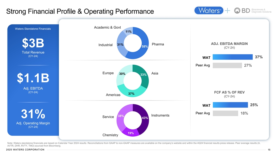 Biosciences & Diagnostic Solutions Have Orchestrated Successful Transformation at Waters Strengthened Innovation Built Commercial Momentum Entered High Growth Adjacencies 2019 NOW PRE-2019 NOW Biologics 20% 35% EMBEDDED Bioseparations Instrument of Pharma Revs of Pharma Revs Bioanalytical OPERATING CADENCE Large Mol Large Mol Replacement characterization Service Plan 43% >50% of active I-Base of active I-Base Attachment LSD DD Clinical Growth CAGR Growth CAGR 1 2 2018-21 2021-24 eCommerce 20% >40% of Chemistry Rev. of Chemistry Rev. Adoption 10x vs. 2019 Batteries Growth levels Expand into 15% >25% of Pharma Rev. of Pharma Rev. Contract Orgs Launch TAM $12B $19B EMBEDDED Excellence STRATEGY & GTM MODEL Note: TAMs are based on internal management estimates. 1. Represents the revenue growth CAGR for the period from FY 2018 to FY 2021, calculated on a GAAP basis. 2. Represents the revenue growth CAGR for the period from FY 2021 to FY 2024, calculated on a GAAP basis. 2025 WATERS CORPORATION 14
