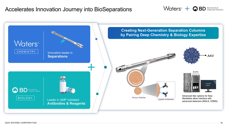 Biosciences & Diagnostic Solutions Strong Financial Profile & Operating Performance Academic & Govt Waters Standalone Financials 11% ADJ. EBITDA MARGIN Pharma 31% Industrial $3B 58% (CY-24) Total Revenue (CY-24) 37% WAT Peer Avg 27% Europe Asia 30% 33% $1.1B Adj. EBITDA (CY-24) FCF AS % OF REV 37% Americas (CY-24) 25% WAT Peer Avg 18% Instruments 38% 31% Service 43% Adj. Operating Margin (CY-24) 19% Chemistry Note: Waters standalone financials are based on Calendar Year 2024 results. Reconciliations from GAAP to non-GAAP measures are available on the company’s website and within the 4Q24 financial results press release. Peer average results (A, AVTR, DHR, RVTY, TMO) sourced from Bloomberg. 2025 WATERS CORPORATION 15