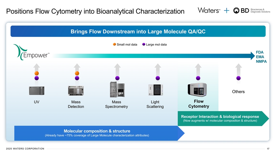 Biosciences & Diagnostic Solutions Accelerates Innovation Journey into BioSeparations to Create a Category-Defining Company Creating Next-Generation Separation Columns by Pairing Deep Chemistry & Biology Expertise CHEMISTRY CHEMISTRY Innovation leader in AAV Separations Advanced titer options for New BIOLOGY Modalities allow interface with Leader in GMP Validated advanced detectors (MALS, CDMS) Antibodies & Reagents 2025 WATERS CORPORATION 16