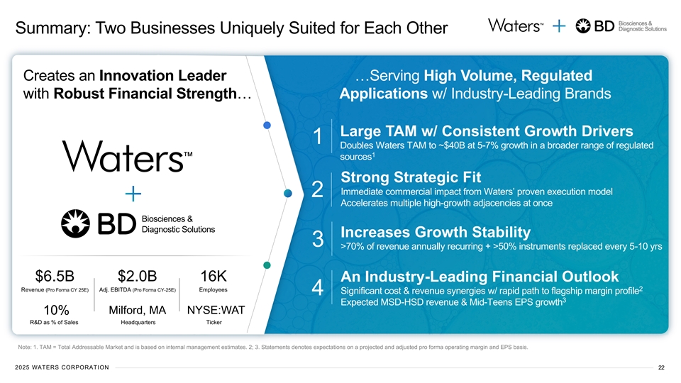 Biosciences & Diagnostic Solutions Transaction Overview ► BD to separate its Biosciences and Diagnostic Solutions business to BD shareholders and simultaneously Structure & Ownership merge SpinCo (which will own the Biosciences/Dx business) with a wholly owned subsidiary of Waters in a tax-efficient Reverse Morris Trust transaction valued at ~$17.5B ► Expected pro forma ownership of 60.8% for Waters shareholders and 39.2% for BD shareholders, subject to certain potential adjustments; BD to receive ~$4B cash distribution via proceeds of SpinCo debt, subject to adjustment, including for cash, working capital and indebtedness ► Company name: Waters Corporation; Listing NYSE:WAT Name & Headquarters ► Group HQ to remain in Milford, MA; will retain significant presence in Biosciences/Dx current key locations ► Waters CEO and CFO to lead joint management team of combined entity Management & Board of Directors ► Waters Board of Directors will remain intact, with addition of up to 2 Board Members from BD ► Expected to close around the end of the first quarter of calendar year 2026, subject to receipt of required Timing & Approvals regulatory approvals, Waters shareholder approval, and satisfaction of other customary closing conditions. ► Transaction unanimously approved by the boards of both Waters and BD 2025 2025 W WA AT TE ER RS S C CO OR RP PO OR RA AT TIIO ON N 21 21