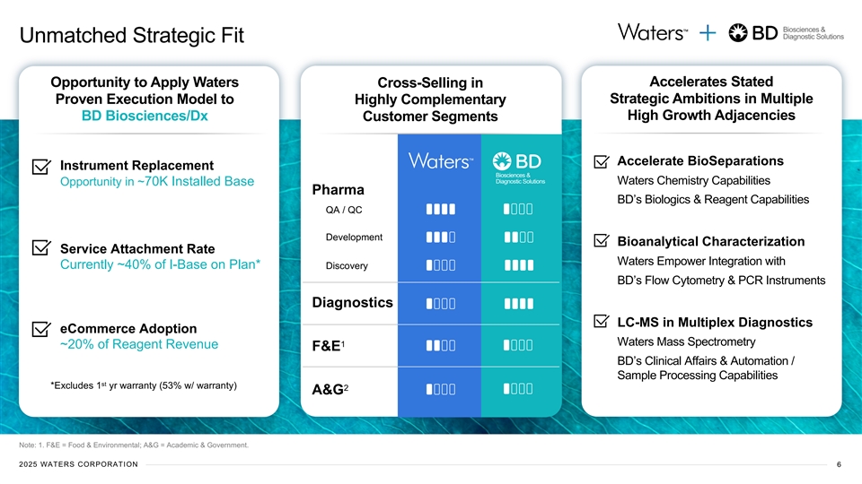Biosciences & Diagnostic Solutions Large TAM w/ Growth Tied to Consistent Volume Expansion End-Markets & Demand Drivers Why it Matters ST A B L E G R O W T H Quality Testing of Pharmaceuticals DRI V E RS Pharma QA/QC End-Points in Late-Stage Pharma Trials (MSD-HSD) # of Biologic Medicines Food & TRULY Expanding Testing Requirements High Volume Testing Environment RECURRING (e.g. PFAS) (MSD+) Driven by Non- Discretionary Spending Microbiology Hospital-Based Infections in Regulated Settings (MSD-HSD) STRONG Antimicrobial Resistance Challenges FINANCIAL PROFILE Molecular Disease Burden Among Aging Population Diagnostics WH E R E Expanding Test Menu for Disease Detection (MSD-HSD) CO NS UM ABL E S ARE SPEC C ED I N = ~$40B TAM w/ 5-7% Market Growth Note: Waters = $19B TAM, growing MSD+, BD Biosciences and Diagnostic Solutions Business = $22B TAM, growing MSD+. TAMs are based on internal management estimates. Growth rates are estimates based on internal analysis of historical, long-term market trend data. Source: Internal data and estimates, consulting data, industry reports, and market research. MSD = Mid single-digit., HSD = High single-digit. 2025 WATERS CORPORATION 5 5