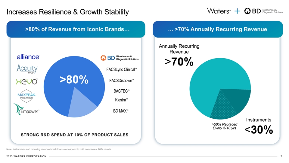 Biosciences & Diagnostic Solutions Unmatched Strategic Fit Accelerates Stated Opportunity to Apply Waters Cross-Selling in Proven Execution Model to Highly Complementary Strategic Ambitions in Multiple BD Biosciences/Dx High Growth Adjacencies Customer Segments Accelerate BioSeparations Instrument Replacement Biosciences & Diagnostic Solutions Waters Chemistry Capabilities Opportunity in ~70K Installed Base Pharma BD’s Biologics & Reagent Capabilities QA / QC Development Bioanalytical Characterization Service Attachment Rate Waters Empower Integration with Currently ~40% of I-Base on Plan* Discovery BD’s Flow Cytometry & PCR Instruments Diagnostics LC-MS in Multiplex Diagnostics eCommerce Adoption Waters Mass Spectrometry 1 ~20% of Reagent Revenue F&E BD’s Clinical Affairs & Automation / Sample Processing Capabilities st *Excludes 1 yr warranty (53% w/ warranty) 2 A&G Note: 1. F&E = Food & Environmental; A&G = Academic & Government. 2025 WATERS CORPORATION 6
