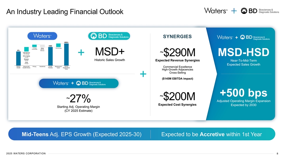 Biosciences & Diagnostic Solutions Increases Resilience & Growth Stability >80% of Revenue from Iconic Brands… … >70% Annually Recurring Revenue Annually Recurring Revenue Biosciences & Diagnostic Solutions >70% ™ FACSLyric Clinical ™ FACSDiscover >80% ™ BACTEC ™ Kiestra ™ BD MAX Instruments >50% Replaced Every 5-10 yrs <30% STRONG R&D SPEND AT 10% OF PRODUCT SALES Note: Instruments and recurring revenue breakdowns correspond to both companies’ 2024 results. 2025 WATERS CORPORATION 7