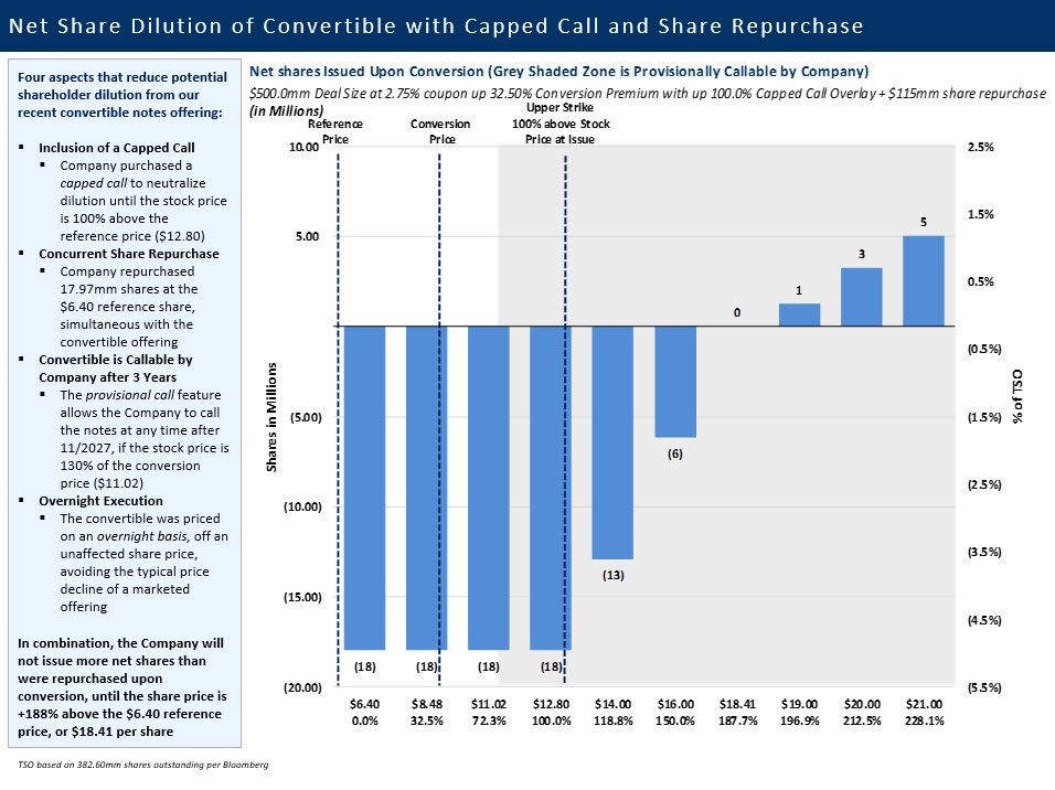 Net Share Dilution of Convertible with Capped Call and Share Repurchase Four aspects that reduce potential shareholder dilution from our recent convertible notes offering:Inclusion of a Capped Call Company purchased a capped call to neutralize dilution until the stock price is 100% above the reference price ($12.80) Concurrent Share Repurchase Company repurchased 17.97mm shares at the $6.40 reference share, simultaneous with the convertible offering Convertible is Callable by Company after 3 Years The provisional call feature allows the Company to call the notes at any time after 11/2027, if the stock price is 130% of the conversion price ($11.02) Overnight Execution The convertible was priced on an overnight basis, off an unaffected share price, avoiding the typical price decline of a marketed offeringIn combination, the Company will not issue more net shares than were repurchased upon conversion, until the share price is +188% above the $6.40 reference price, or $18.41 per share