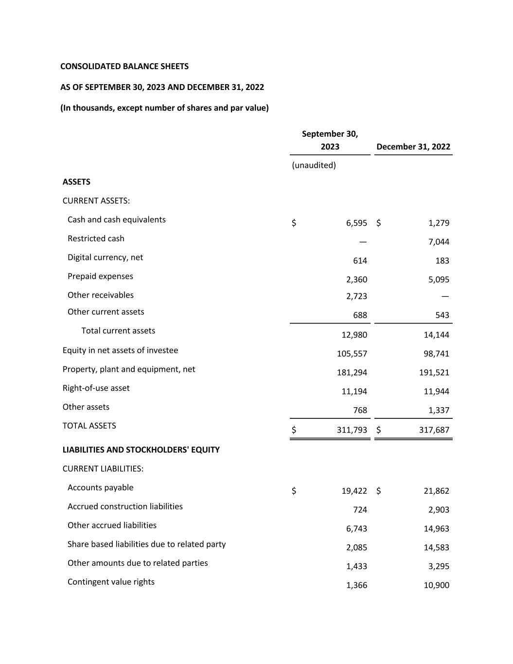 CONSOLIDATED BALANCE SHEETS AS OF SEPTEMBER 30, 2023 AND DECEMBER 31, 2022 (In thousands, except number of shares and par value) September 30, 2023 December 31, 2022 (unaudited) ASSETS CURRENT ASSETS: Cash and cash equivalents $ 6,595 $ 1,279 Restricted cash — 7,044 Digital currency, net 614 183 Prepaid expenses 2,360 5,095 Other receivables 2,723 — Other current assets 688 543 Total current assets 12,980 14,144 Equity in net assets of investee 105,557 98,741 Property, plant and equipment, net 181,294 191,521 Right-of-use asset 11,194 11,944 Other assets 768 1,337 TOTAL ASSETS $ 311,793 $ 317,687 LIABILITIES AND STOCKHOLDERS' EQUITY CURRENT LIABILITIES: Accounts payable $ 19,422 $ 21,862 Accrued construction liabilities 724 2,903 Other accrued liabilities 6,743 14,963 Share based liabilities due to related party 2,085 14,583 Other amounts due to related parties 1,433 3,295 Contingent value rights 1,366 10,900