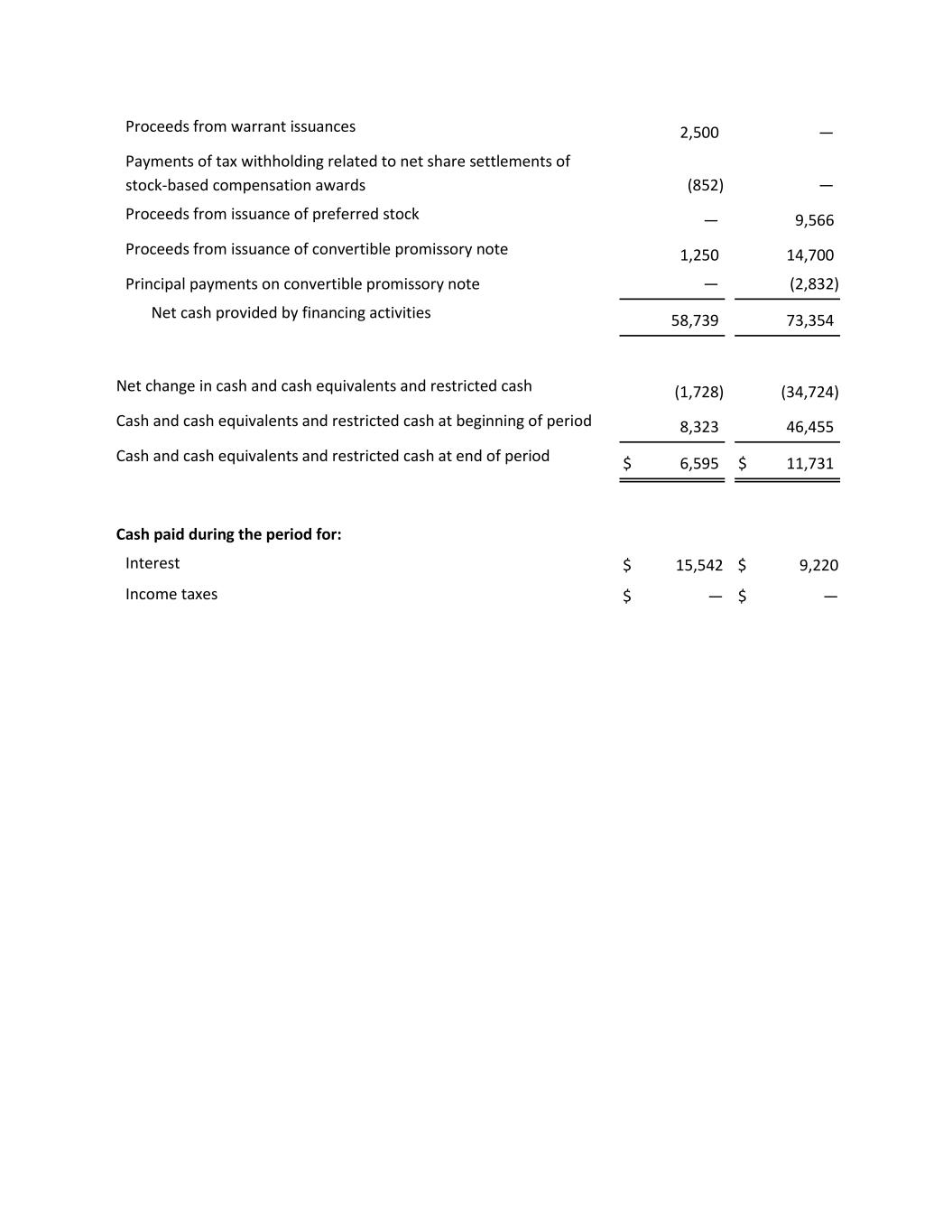 Proceeds from warrant issuances 2,500 — Payments of tax withholding related to net share settlements of stock-based compensation awards (852) — Proceeds from issuance of preferred stock — 9,566 Proceeds from issuance of convertible promissory note 1,250 14,700 Principal payments on convertible promissory note — (2,832) Net cash provided by financing activities 58,739 73,354 Net change in cash and cash equivalents and restricted cash (1,728) (34,724) Cash and cash equivalents and restricted cash at beginning of period 8,323 46,455 Cash and cash equivalents and restricted cash at end of period $ 6,595 $ 11,731 Cash paid during the period for: Interest $ 15,542 $ 9,220 Income taxes $ — $ —