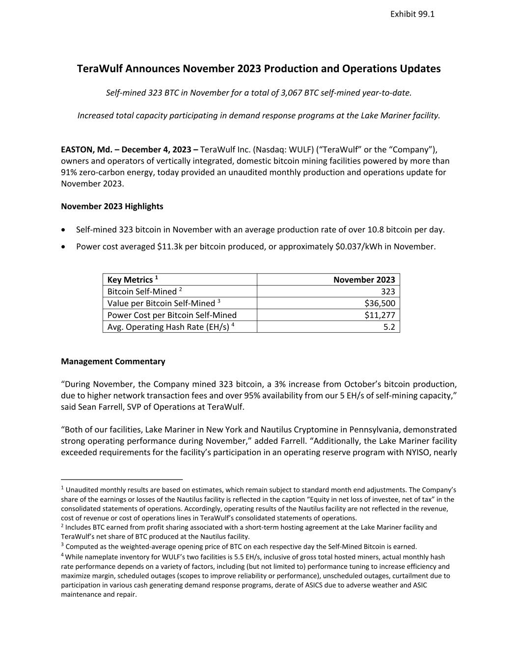 TeraWulf Announces November 2023 Production and Operations Updates  Self‐mined 323 BTC in November for a total of 3,067 BTC self‐mined year‐to‐date.  Increased total capacity participating in demand response programs at the Lake Mariner facility.  EASTON, Md. – December 4, 2023 – TeraWulf Inc. (Nasdaq: WULF) (“TeraWulf” or the “Company”),  owners and operators of vertically integrated, domestic bitcoin mining facilities powered by more than  91% zero‐carbon energy, today provided an unaudited monthly production and operations update for  November 2023.   November 2023 Highlights  Self‐mined 323 bitcoin in November with an average production rate of over 10.8 bitcoin per day.  Power cost averaged $11.3k per bitcoin produced, or approximately $0.037/kWh in November. Key Metrics 1  November 2023  Bitcoin Self‐Mined 2  323  Value per Bitcoin Self‐Mined 3  $36,500  Power Cost per Bitcoin Self‐Mined  $11,277  Avg. Operating Hash Rate (EH/s) 4  5.2  Management Commentary  “During November, the Company mined 323 bitcoin, a 3%  increase from October’s bitcoin production,  due to higher network transaction fees and over 95% availability from our 5 EH/s of self‐mining capacity,”  said Sean Farrell, SVP of Operations at TeraWulf.   “Both of our facilities, Lake Mariner in New York and Nautilus Cryptomine in Pennsylvania, demonstrated  strong operating performance during November,” added Farrell. “Additionally, the Lake Mariner facility  exceeded requirements for the facility’s participation in an operating reserve program with NYISO, nearly  1 Unaudited monthly results are based on estimates, which remain subject to standard month end adjustments. The Company’s  share of the earnings or losses of the Nautilus facility is reflected in the caption “Equity in net loss of investee, net of tax” in the  consolidated statements of operations. Accordingly, operating results of the Nautilus facility are not reflected in the revenue,  cost of revenue or cost of operations lines in TeraWulf’s consolidated statements of operations.   2 Includes BTC earned from profit sharing associated with a short‐term hosting agreement at the Lake Mariner facility and  TeraWulf’s net share of BTC produced at the Nautilus facility.  3 Computed as the weighted‐average opening price of BTC on each respective day the Self‐Mined Bitcoin is earned.  4 While nameplate inventory for WULF’s two facilities is 5.5 EH/s, inclusive of gross total hosted miners, actual monthly hash  rate performance depends on a variety of factors, including (but not limited to) performance tuning to increase efficiency and  maximize margin, scheduled outages (scopes to improve reliability or performance), unscheduled outages, curtailment due to  participation in various cash generating demand response programs, derate of ASICS due to adverse weather and ASIC  maintenance and repair.  Exhibit 99.1
