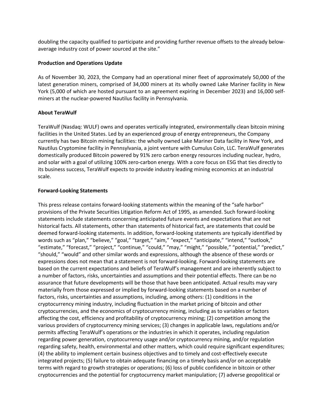 doubling the capacity qualified to participate and providing further revenue offsets to the already below‐ average industry cost of power sourced at the site.”     Production and Operations Update    As of November 30, 2023, the Company had an operational miner fleet of approximately 50,000 of the  latest generation miners, comprised of 34,000 miners at  its wholly owned Lake Mariner facility  in New  York (5,000 of which are hosted pursuant to an agreement expiring in December 2023) and 16,000 self‐ miners at the nuclear‐powered Nautilus facility in Pennsylvania.     About TeraWulf    TeraWulf (Nasdaq: WULF) owns and operates vertically integrated, environmentally clean bitcoin mining  facilities in the United States. Led by an experienced group of energy entrepreneurs, the Company  currently has two Bitcoin mining facilities: the wholly owned Lake Mariner Data facility in New York, and  Nautilus Cryptomine facility in Pennsylvania, a joint venture with Cumulus Coin, LLC. TeraWulf generates  domestically produced Bitcoin powered by 91% zero carbon energy resources including nuclear, hydro,  and solar with a goal of utilizing 100% zero‐carbon energy. With a core focus on ESG that ties directly to  its business success, TeraWulf expects to provide industry leading mining economics at an industrial  scale.    Forward‐Looking Statements     This press release contains forward‐looking statements within the meaning of the “safe harbor”  provisions of the Private Securities Litigation Reform Act of 1995, as amended. Such forward‐looking  statements include statements concerning anticipated future events and expectations that are not  historical facts. All statements, other than statements of historical fact, are statements that could be  deemed forward‐looking statements. In addition, forward‐looking statements are typically identified by  words such as “plan,” “believe,” “goal,” “target,” “aim,” “expect,” “anticipate,” “intend,” “outlook,”  “estimate,” “forecast,” “project,” “continue,” “could,” “may,” “might,” “possible,” “potential,” “predict,”  “should,” “would” and other similar words and expressions, although the absence of these words or  expressions does not mean that a statement is not forward‐looking. Forward‐looking statements are  based on the current expectations and beliefs of TeraWulf’s management and are inherently subject to  a number of factors, risks, uncertainties and assumptions and their potential effects. There can be no  assurance that future developments will be those that have been anticipated. Actual results may vary  materially from those expressed or implied by forward‐looking statements based on a number of  factors, risks, uncertainties and assumptions, including, among others: (1) conditions in the  cryptocurrency mining industry, including fluctuation in the market pricing of bitcoin and other  cryptocurrencies, and the economics of cryptocurrency mining, including as to variables or factors  affecting the cost, efficiency and profitability of cryptocurrency mining; (2) competition among the  various providers of cryptocurrency mining services; (3) changes in applicable laws, regulations and/or  permits affecting TeraWulf’s operations or the industries in which it operates, including regulation  regarding power generation, cryptocurrency usage and/or cryptocurrency mining, and/or regulation  regarding safety, health, environmental and other matters, which could require significant expenditures;  (4) the ability to implement certain business objectives and to timely and cost‐effectively execute  integrated projects; (5) failure to obtain adequate financing on a timely basis and/or on acceptable  terms with regard to growth strategies or operations; (6) loss of public confidence in bitcoin or other  cryptocurrencies and the potential for cryptocurrency market manipulation; (7) adverse geopolitical or