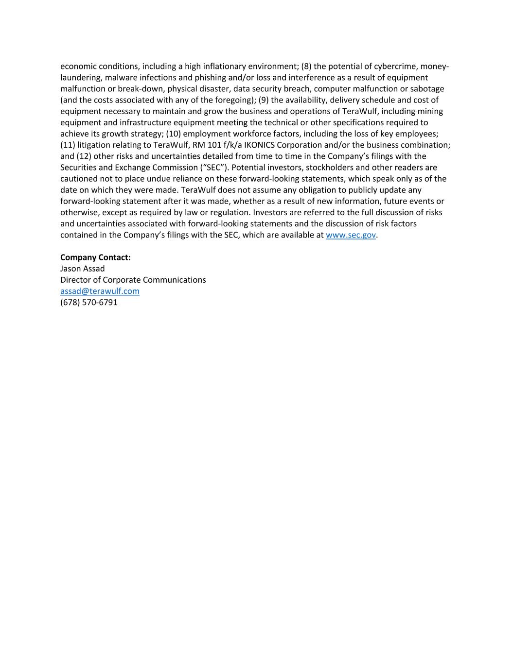 economic conditions, including a high inflationary environment; (8) the potential of cybercrime, money‐ laundering, malware infections and phishing and/or loss and interference as a result of equipment  malfunction or break‐down, physical disaster, data security breach, computer malfunction or sabotage  (and the costs associated with any of the foregoing); (9) the availability, delivery schedule and cost of  equipment necessary to maintain and grow the business and operations of TeraWulf, including mining  equipment and infrastructure equipment meeting the technical or other specifications required to  achieve its growth strategy; (10) employment workforce factors, including the loss of key employees;  (11) litigation relating to TeraWulf, RM 101 f/k/a IKONICS Corporation and/or the business combination;  and (12) other risks and uncertainties detailed from time to time in the Company’s filings with the  Securities and Exchange Commission (“SEC”). Potential investors, stockholders and other readers are  cautioned not to place undue reliance on these forward‐looking statements, which speak only as of the  date on which they were made. TeraWulf does not assume any obligation to publicly update any  forward‐looking statement after it was made, whether as a result of new information, future events or  otherwise, except as required by law or regulation. Investors are referred to the full discussion of risks  and uncertainties associated with forward‐looking statements and the discussion of risk factors  contained in the Company’s filings with the SEC, which are available at www.sec.gov.     Company Contact:  Jason Assad  Director of Corporate Communications  assad@terawulf.com  (678) 570‐6791
