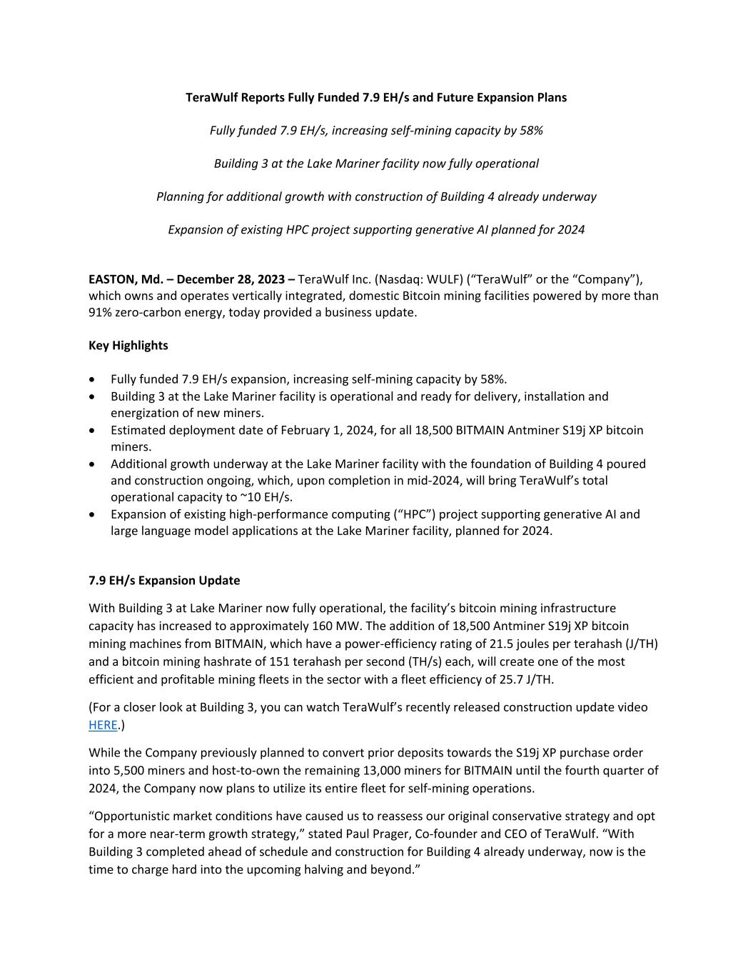 TeraWulf Reports Fully Funded 7.9 EH/s and Future Expansion Plans    Fully funded 7.9 EH/s, increasing self‐mining capacity by 58%    Building 3 at the Lake Mariner facility now fully operational    Planning for additional growth with construction of Building 4 already underway    Expansion of existing HPC project supporting generative AI planned for 2024      EASTON, Md. – December 28, 2023 – TeraWulf Inc. (Nasdaq: WULF) (“TeraWulf” or the “Company”),  which owns and operates vertically integrated, domestic Bitcoin mining facilities powered by more than  91% zero‐carbon energy, today provided a business update.    Key Highlights     Fully funded 7.9 EH/s expansion, increasing self‐mining capacity by 58%.   Building 3 at the Lake Mariner facility is operational and ready for delivery, installation and  energization of new miners.   Estimated deployment date of February 1, 2024, for all 18,500 BITMAIN Antminer S19j XP bitcoin  miners.   Additional growth underway at the Lake Mariner facility with the foundation of Building 4 poured  and construction ongoing, which, upon completion in mid‐2024, will bring TeraWulf’s total  operational capacity to ~10 EH/s.   Expansion of existing high‐performance computing (“HPC”) project supporting generative AI and  large language model applications at the Lake Mariner facility, planned for 2024.      7.9 EH/s Expansion Update  With Building 3 at Lake Mariner now fully operational, the facility’s bitcoin mining infrastructure  capacity has increased to approximately 160 MW. The addition of 18,500 Antminer S19j XP bitcoin  mining machines from BITMAIN, which have a power‐efficiency rating of 21.5 joules per terahash (J/TH)  and a bitcoin mining hashrate of 151 terahash per second (TH/s) each, will create one of the most  efficient and profitable mining fleets in the sector with a fleet efficiency of 25.7 J/TH.   (For a closer look at Building 3, you can watch TeraWulf’s recently released construction update video  HERE.)  While the Company previously planned to convert prior deposits towards the S19j XP purchase order  into 5,500 miners and host‐to‐own the remaining 13,000 miners for BITMAIN until the fourth quarter of  2024, the Company now plans to utilize its entire fleet for self‐mining operations.   “Opportunistic market conditions have caused us to reassess our original conservative strategy and opt  for a more near‐term growth strategy,” stated Paul Prager, Co‐founder and CEO of TeraWulf. “With  Building 3 completed ahead of schedule and construction for Building 4 already underway, now is the  time to charge hard into the upcoming halving and beyond.”
