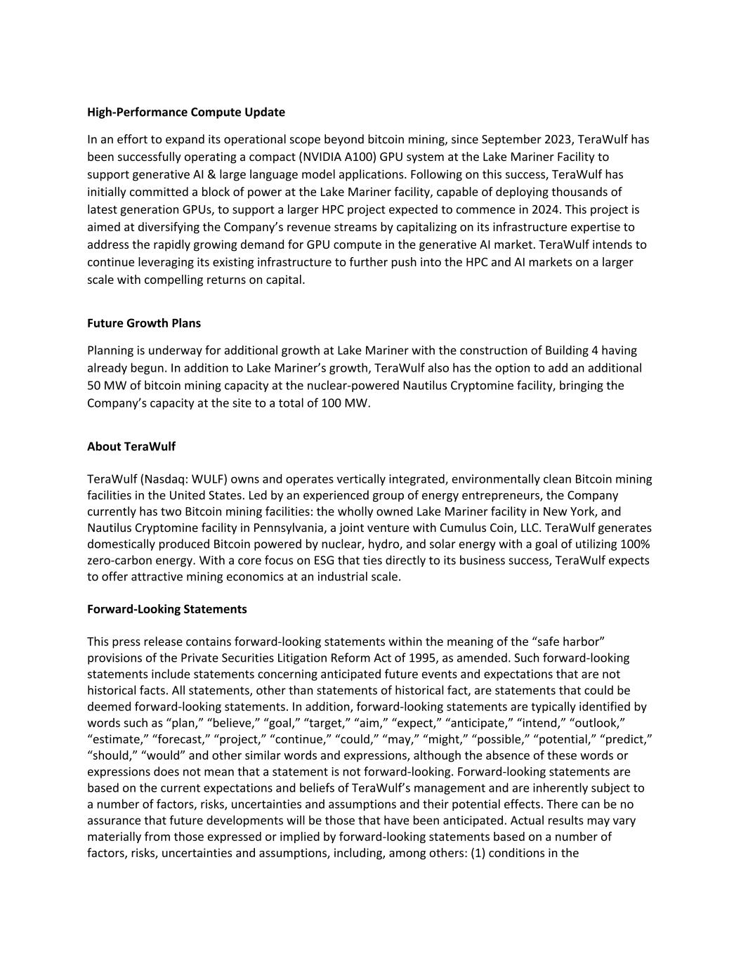 High‐Performance Compute Update  In an effort to expand its operational scope beyond bitcoin mining, since September 2023, TeraWulf has  been successfully operating a compact (NVIDIA A100) GPU system at the Lake Mariner Facility to  support generative AI & large language model applications. Following on this success, TeraWulf has  initially committed a block of power at the Lake Mariner facility, capable of deploying thousands of  latest generation GPUs, to support a larger HPC project expected to commence in 2024. This project is  aimed at diversifying the Company’s revenue streams by capitalizing on its infrastructure expertise to  address the rapidly growing demand for GPU compute in the generative AI market. TeraWulf intends to  continue leveraging its existing infrastructure to further push into the HPC and AI markets on a larger  scale with compelling returns on capital.    Future Growth Plans  Planning is underway for additional growth at Lake Mariner with the construction of Building 4 having  already begun. In addition to Lake Mariner’s growth, TeraWulf also has the option to add an additional  50 MW of bitcoin mining capacity at the nuclear‐powered Nautilus Cryptomine facility, bringing the  Company’s capacity at the site to a total of 100 MW.    About TeraWulf    TeraWulf (Nasdaq: WULF) owns and operates vertically integrated, environmentally clean Bitcoin mining  facilities in the United States. Led by an experienced group of energy entrepreneurs, the Company  currently has two Bitcoin mining facilities: the wholly owned Lake Mariner facility in New York, and  Nautilus Cryptomine facility in Pennsylvania, a joint venture with Cumulus Coin, LLC. TeraWulf generates  domestically produced Bitcoin powered by nuclear, hydro, and solar energy with a goal of utilizing 100%  zero‐carbon energy. With a core focus on ESG that ties directly to its business success, TeraWulf expects  to offer attractive mining economics at an industrial scale.    Forward‐Looking Statements     This press release contains forward‐looking statements within the meaning of the “safe harbor”  provisions of the Private Securities Litigation Reform Act of 1995, as amended. Such forward‐looking  statements include statements concerning anticipated future events and expectations that are not  historical facts. All statements, other than statements of historical fact, are statements that could be  deemed forward‐looking statements. In addition, forward‐looking statements are typically identified by  words such as “plan,” “believe,” “goal,” “target,” “aim,” “expect,” “anticipate,” “intend,” “outlook,”  “estimate,” “forecast,” “project,” “continue,” “could,” “may,” “might,” “possible,” “potential,” “predict,”  “should,” “would” and other similar words and expressions, although the absence of these words or  expressions does not mean that a statement is not forward‐looking. Forward‐looking statements are  based on the current expectations and beliefs of TeraWulf’s management and are inherently subject to  a number of factors, risks, uncertainties and assumptions and their potential effects. There can be no  assurance that future developments will be those that have been anticipated. Actual results may vary  materially from those expressed or implied by forward‐looking statements based on a number of  factors, risks, uncertainties and assumptions, including, among others: (1) conditions in the