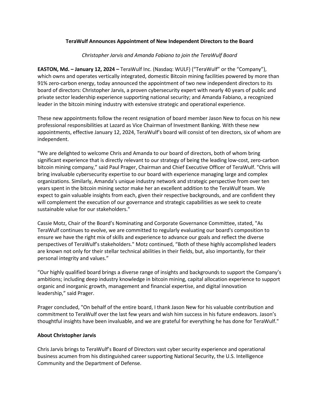 TeraWulf Announces Appointment of New Independent Directors to the Board Christopher Jarvis and Amanda Fabiano to join the TeraWulf Board EASTON, Md. – January 12, 2024 – TeraWulf Inc. (Nasdaq: WULF) (“TeraWulf” or the “Company”), which owns and operates vertically integrated, domestic Bitcoin mining facilities powered by more than 91% zero-carbon energy, today announced the appointment of two new independent directors to its board of directors: Christopher Jarvis, a proven cybersecurity expert with nearly 40 years of public and private sector leadership experience supporting national security; and Amanda Fabiano, a recognized leader in the bitcoin mining industry with extensive strategic and operational experience. These new appointments follow the recent resignation of board member Jason New to focus on his new professional responsibilities at Lazard as Vice Chairman of Investment Banking. With these new appointments, effective January 12, 2024, TeraWulf’s board will consist of ten directors, six of whom are independent. "We are delighted to welcome Chris and Amanda to our board of directors, both of whom bring significant experience that is directly relevant to our strategy of being the leading low-cost, zero-carbon bitcoin mining company,” said Paul Prager, Chairman and Chief Executive Officer of TeraWulf. "Chris will bring invaluable cybersecurity expertise to our board with experience managing large and complex organizations. Similarly, Amanda’s unique industry network and strategic perspective from over ten years spent in the bitcoin mining sector make her an excellent addition to the TeraWulf team. We expect to gain valuable insights from each, given their respective backgrounds, and are confident they will complement the execution of our governance and strategic capabilities as we seek to create sustainable value for our stakeholders." Cassie Motz, Chair of the Board’s Nominating and Corporate Governance Committee, stated, "As TeraWulf continues to evolve, we are committed to regularly evaluating our board's composition to ensure we have the right mix of skills and experience to advance our goals and reflect the diverse perspectives of TeraWulf’s stakeholders." Motz continued, “Both of these highly accomplished leaders are known not only for their stellar technical abilities in their fields, but, also importantly, for their personal integrity and values.” “Our highly qualified board brings a diverse range of insights and backgrounds to support the Company’s ambitions; including deep industry knowledge in bitcoin mining, capital allocation experience to support organic and inorganic growth, management and financial expertise, and digital innovation leadership,” said Prager. Prager concluded, "On behalf of the entire board, I thank Jason New for his valuable contribution and commitment to TeraWulf over the last few years and wish him success in his future endeavors. Jason’s thoughtful insights have been invaluable, and we are grateful for everything he has done for TeraWulf." About Christopher Jarvis Chris Jarvis brings to TeraWulf’s Board of Directors vast cyber security experience and operational business acumen from his distinguished career supporting National Security, the U.S. Intelligence Community and the Department of Defense.