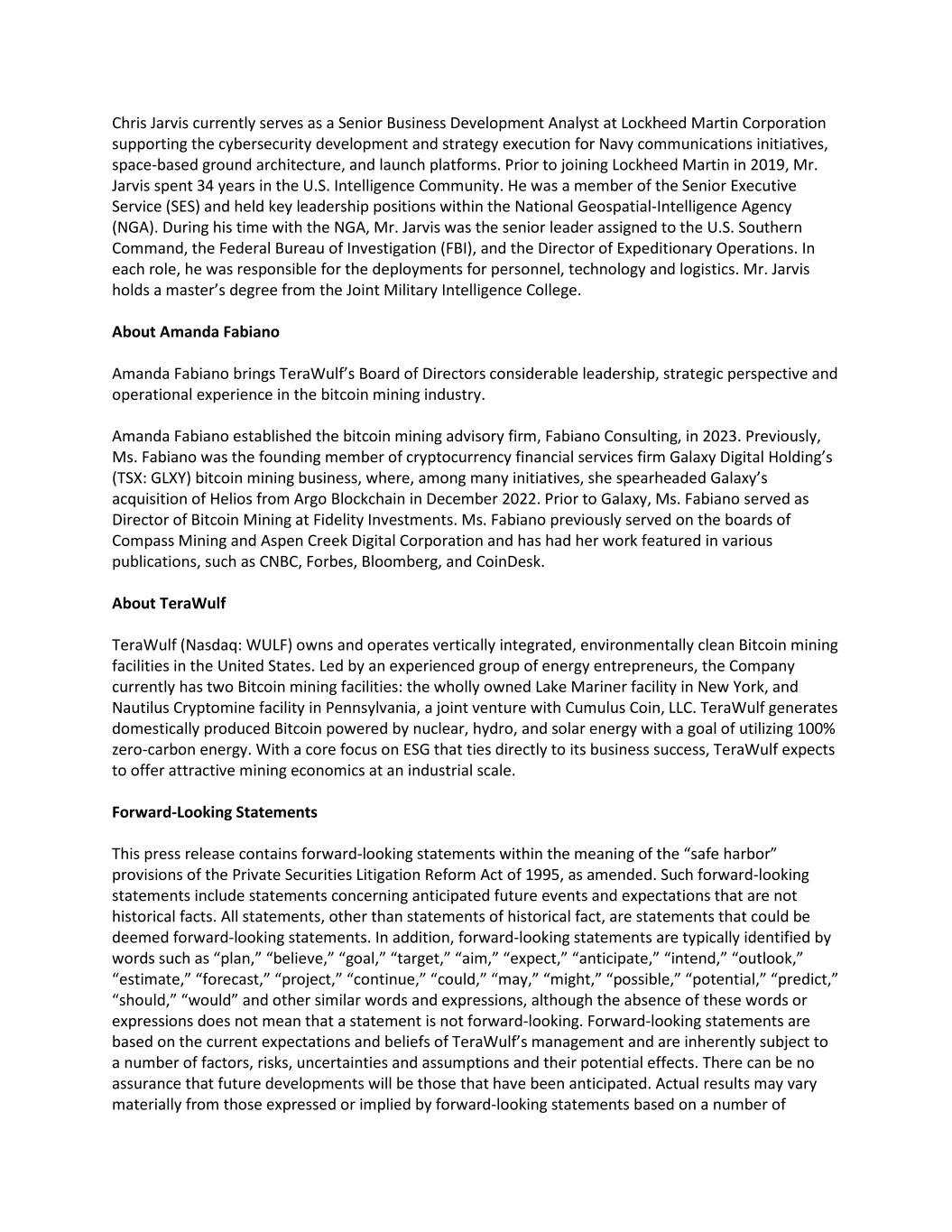 Chris Jarvis currently serves as a Senior Business Development Analyst at Lockheed Martin Corporation supporting the cybersecurity development and strategy execution for Navy communications initiatives, space-based ground architecture, and launch platforms. Prior to joining Lockheed Martin in 2019, Mr. Jarvis spent 34 years in the U.S. Intelligence Community. He was a member of the Senior Executive Service (SES) and held key leadership positions within the National Geospatial-Intelligence Agency (NGA). During his time with the NGA, Mr. Jarvis was the senior leader assigned to the U.S. Southern Command, the Federal Bureau of Investigation (FBI), and the Director of Expeditionary Operations. In each role, he was responsible for the deployments for personnel, technology and logistics. Mr. Jarvis holds a master’s degree from the Joint Military Intelligence College. About Amanda Fabiano Amanda Fabiano brings TeraWulf’s Board of Directors considerable leadership, strategic perspective and operational experience in the bitcoin mining industry. Amanda Fabiano established the bitcoin mining advisory firm, Fabiano Consulting, in 2023. Previously, Ms. Fabiano was the founding member of cryptocurrency financial services firm Galaxy Digital Holding’s (TSX: GLXY) bitcoin mining business, where, among many initiatives, she spearheaded Galaxy’s acquisition of Helios from Argo Blockchain in December 2022. Prior to Galaxy, Ms. Fabiano served as Director of Bitcoin Mining at Fidelity Investments. Ms. Fabiano previously served on the boards of Compass Mining and Aspen Creek Digital Corporation and has had her work featured in various publications, such as CNBC, Forbes, Bloomberg, and CoinDesk. About TeraWulf TeraWulf (Nasdaq: WULF) owns and operates vertically integrated, environmentally clean Bitcoin mining facilities in the United States. Led by an experienced group of energy entrepreneurs, the Company currently has two Bitcoin mining facilities: the wholly owned Lake Mariner facility in New York, and Nautilus Cryptomine facility in Pennsylvania, a joint venture with Cumulus Coin, LLC. TeraWulf generates domestically produced Bitcoin powered by nuclear, hydro, and solar energy with a goal of utilizing 100% zero-carbon energy. With a core focus on ESG that ties directly to its business success, TeraWulf expects to offer attractive mining economics at an industrial scale. Forward-Looking Statements This press release contains forward-looking statements within the meaning of the “safe harbor” provisions of the Private Securities Litigation Reform Act of 1995, as amended. Such forward-looking statements include statements concerning anticipated future events and expectations that are not historical facts. All statements, other than statements of historical fact, are statements that could be deemed forward-looking statements. In addition, forward-looking statements are typically identified by words such as “plan,” “believe,” “goal,” “target,” “aim,” “expect,” “anticipate,” “intend,” “outlook,” “estimate,” “forecast,” “project,” “continue,” “could,” “may,” “might,” “possible,” “potential,” “predict,” “should,” “would” and other similar words and expressions, although the absence of these words or expressions does not mean that a statement is not forward-looking. Forward-looking statements are based on the current expectations and beliefs of TeraWulf’s management and are inherently subject to a number of factors, risks, uncertainties and assumptions and their potential effects. There can be no assurance that future developments will be those that have been anticipated. Actual results may vary materially from those expressed or implied by forward-looking statements based on a number of