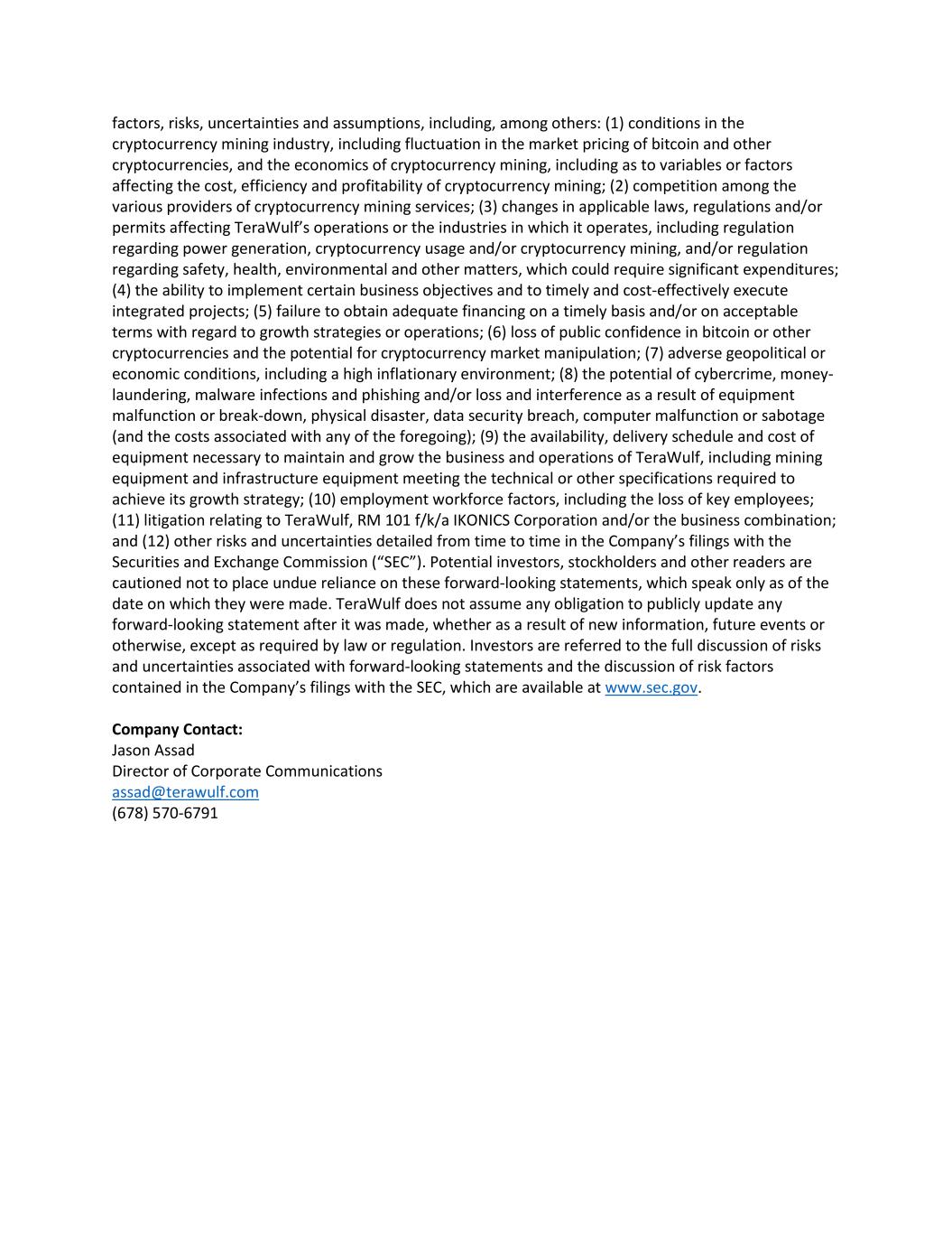 factors, risks, uncertainties and assumptions, including, among others: (1) conditions in the cryptocurrency mining industry, including fluctuation in the market pricing of bitcoin and other cryptocurrencies, and the economics of cryptocurrency mining, including as to variables or factors affecting the cost, efficiency and profitability of cryptocurrency mining; (2) competition among the various providers of cryptocurrency mining services; (3) changes in applicable laws, regulations and/or permits affecting TeraWulf’s operations or the industries in which it operates, including regulation regarding power generation, cryptocurrency usage and/or cryptocurrency mining, and/or regulation regarding safety, health, environmental and other matters, which could require significant expenditures; (4) the ability to implement certain business objectives and to timely and cost-effectively execute integrated projects; (5) failure to obtain adequate financing on a timely basis and/or on acceptable terms with regard to growth strategies or operations; (6) loss of public confidence in bitcoin or other cryptocurrencies and the potential for cryptocurrency market manipulation; (7) adverse geopolitical or economic conditions, including a high inflationary environment; (8) the potential of cybercrime, money- laundering, malware infections and phishing and/or loss and interference as a result of equipment malfunction or break-down, physical disaster, data security breach, computer malfunction or sabotage (and the costs associated with any of the foregoing); (9) the availability, delivery schedule and cost of equipment necessary to maintain and grow the business and operations of TeraWulf, including mining equipment and infrastructure equipment meeting the technical or other specifications required to achieve its growth strategy; (10) employment workforce factors, including the loss of key employees; (11) litigation relating to TeraWulf, RM 101 f/k/a IKONICS Corporation and/or the business combination; and (12) other risks and uncertainties detailed from time to time in the Company’s filings with the Securities and Exchange Commission (“SEC”). Potential investors, stockholders and other readers are cautioned not to place undue reliance on these forward-looking statements, which speak only as of the date on which they were made. TeraWulf does not assume any obligation to publicly update any forward-looking statement after it was made, whether as a result of new information, future events or otherwise, except as required by law or regulation. Investors are referred to the full discussion of risks and uncertainties associated with forward-looking statements and the discussion of risk factors contained in the Company’s filings with the SEC, which are available at www.sec.gov. Company Contact: Jason Assad Director of Corporate Communications assad@terawulf.com (678) 570-6791