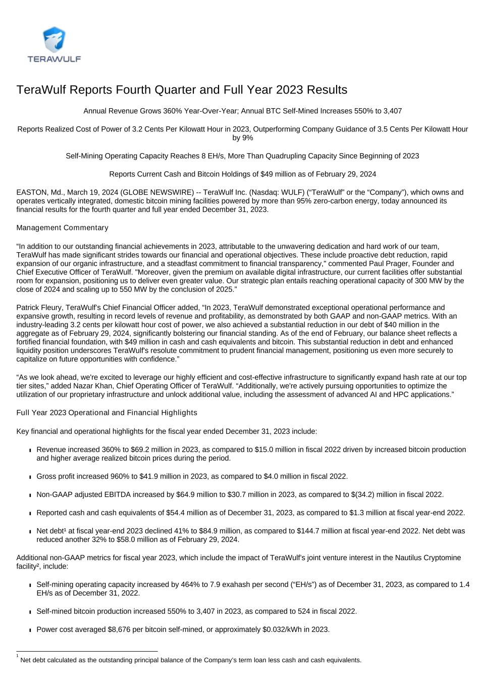 TeraWulf Reports Fourth Quarter and Full Year 2023 Results Annual Revenue Grows 360% Year-Over-Year; Annual BTC Self-Mined Increases 550% to 3,407 Reports Realized Cost of Power of 3.2 Cents Per Kilowatt Hour in 2023, Outperforming Company Guidance of 3.5 Cents Per Kilowatt Hour by 9% Self-Mining Operating Capacity Reaches 8 EH/s, More Than Quadrupling Capacity Since Beginning of 2023 Reports Current Cash and Bitcoin Holdings of $49 million as of February 29, 2024 EASTON, Md., March 19, 2024 (GLOBE NEWSWIRE) -- TeraWulf Inc. (Nasdaq: WULF) (“TeraWulf” or the “Company”), which owns and operates vertically integrated, domestic bitcoin mining facilities powered by more than 95% zero-carbon energy, today announced its financial results for the fourth quarter and full year ended December 31, 2023. Management Commentary “In addition to our outstanding financial achievements in 2023, attributable to the unwavering dedication and hard work of our team, TeraWulf has made significant strides towards our financial and operational objectives. These include proactive debt reduction, rapid expansion of our organic infrastructure, and a steadfast commitment to financial transparency," commented Paul Prager, Founder and Chief Executive Officer of TeraWulf. "Moreover, given the premium on available digital infrastructure, our current facilities offer substantial room for expansion, positioning us to deliver even greater value. Our strategic plan entails reaching operational capacity of 300 MW by the close of 2024 and scaling up to 550 MW by the conclusion of 2025.” Patrick Fleury, TeraWulf’s Chief Financial Officer added, “In 2023, TeraWulf demonstrated exceptional operational performance and expansive growth, resulting in record levels of revenue and profitability, as demonstrated by both GAAP and non-GAAP metrics. With an industry-leading 3.2 cents per kilowatt hour cost of power, we also achieved a substantial reduction in our debt of $40 million in the aggregate as of February 29, 2024, significantly bolstering our financial standing. As of the end of February, our balance sheet reflects a fortified financial foundation, with $49 million in cash and cash equivalents and bitcoin. This substantial reduction in debt and enhanced liquidity position underscores TeraWulf's resolute commitment to prudent financial management, positioning us even more securely to capitalize on future opportunities with confidence.” “As we look ahead, we're excited to leverage our highly efficient and cost-effective infrastructure to significantly expand hash rate at our top tier sites,” added Nazar Khan, Chief Operating Officer of TeraWulf. “Additionally, we're actively pursuing opportunities to optimize the utilization of our proprietary infrastructure and unlock additional value, including the assessment of advanced AI and HPC applications.” Full Year 2023 Operational and Financial Highlights Key financial and operational highlights for the fiscal year ended December 31, 2023 include: Š Revenue increased 360% to $69.2 million in 2023, as compared to $15.0 million in fiscal 2022 driven by increased bitcoin production and higher average realized bitcoin prices during the period. Š Gross profit increased 960% to $41.9 million in 2023, as compared to $4.0 million in fiscal 2022. Š Non-GAAP adjusted EBITDA increased by $64.9 million to $30.7 million in 2023, as compared to $(34.2) million in fiscal 2022. Š Reported cash and cash equivalents of $54.4 million as of December 31, 2023, as compared to $1.3 million at fiscal year-end 2022. Š Net debt¹ at fiscal year-end 2023 declined 41% to $84.9 million, as compared to $144.7 million at fiscal year-end 2022. Net debt was reduced another 32% to $58.0 million as of February 29, 2024. Additional non-GAAP metrics for fiscal year 2023, which include the impact of TeraWulf’s joint venture interest in the Nautilus Cryptomine facility², include: Š Self-mining operating capacity increased by 464% to 7.9 exahash per second (“EH/s”) as of December 31, 2023, as compared to 1.4 EH/s as of December 31, 2022. Š Self-mined bitcoin production increased 550% to 3,407 in 2023, as compared to 524 in fiscal 2022. Š Power cost averaged $8,676 per bitcoin self-mined, or approximately $0.032/kWh in 2023. ___________________________________ ¹ Net debt calculated as the outstanding principal balance of the Company’s term loan less cash and cash equivalents.